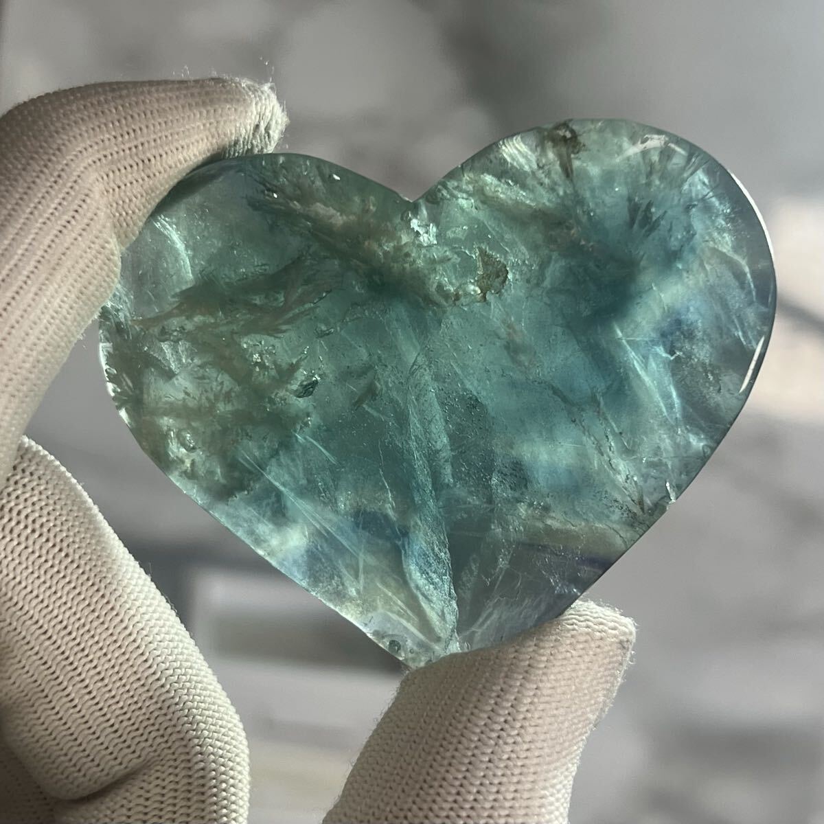 エンジェルフェザーフローライトのハートの透け感と天使の羽根の模様は、自然な美しさを感じさせます。