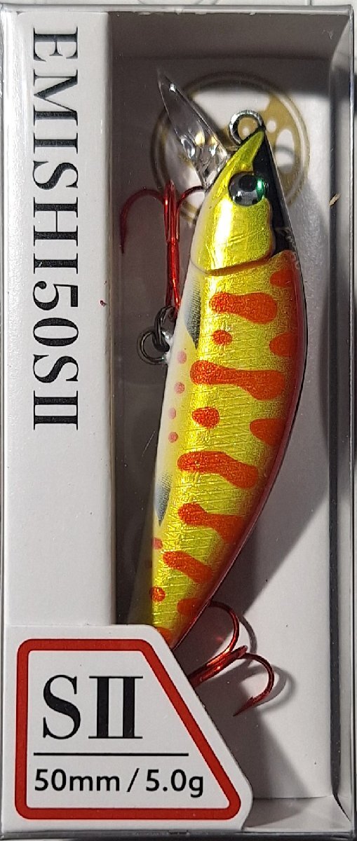 イトウクラフト EMISHI 50S TYPE-II (蝦夷 50S タイプ2) カラー:GYR SIZE : 50mm TYPE : HEAVY SINKING WT : 5.0g HOOK : TREBLE ♯12(RED) ニューデザインリップとウエイトの重心バランスが考慮され、進化を遂げた蝦夷50Sタイプ2。5gとは思えない操作性を実現。多彩なフィールドで優れたパフォーマンスを発揮し、釣りの魅力を最大限に引き出します。 こちらの商品は店舗、ヤフーショッピング店、店と在庫を共有しているため、時間差で売り切れの場合が御座います。予めご了承下さい。