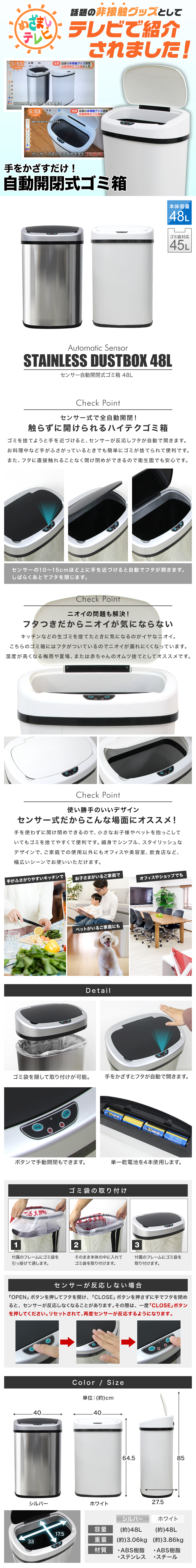 \ 手をかざすとセンサーが感知してフタが開きます / とっても便利! センサーでフタが自動開閉! 直接手を触れずに開けられるので、とっても衛生的です! 台所はもちろんのこと、赤ちゃんのおむつ捨て、医療の現場にもぴったりです! 手動で開閉OK! 操作パネルには、センサーの他に手動で開けたり閉じたりできるするボタンが付いています。 大容量な48Lタイプでシンプルなデザイン。 キッチンやリビングなどに置いてもマッチしやすいです。 【商品コード】FHB003BK 【仕様】 カラー:ブラック 容量:48L サイズ:(約)幅40cm×奥行き27.5cm×高さ64.5cm 重量:(約)3kg 使用電池:単一電池×4(別売) 素材:スチール、ステンレス、ABS 他 【注意事項】 ・本商品には電池は付属しておりません。 ・商品は、モニターによって色合いが異なって見える場合があります。 ・仕様・デザインは改良のため予告なく変更することがあります。 【もちろん新品未使用品です】 ▼検索ワード ゴミ箱 ごみ箱 ダストボックス ふた付き おしゃれ 分別 室内 スリム キッチン インテリア雑貨 北欧 リビング くずかご かわいい デザイン 生ごみ オムツ 見えない 収納 カウンター コンパクト |