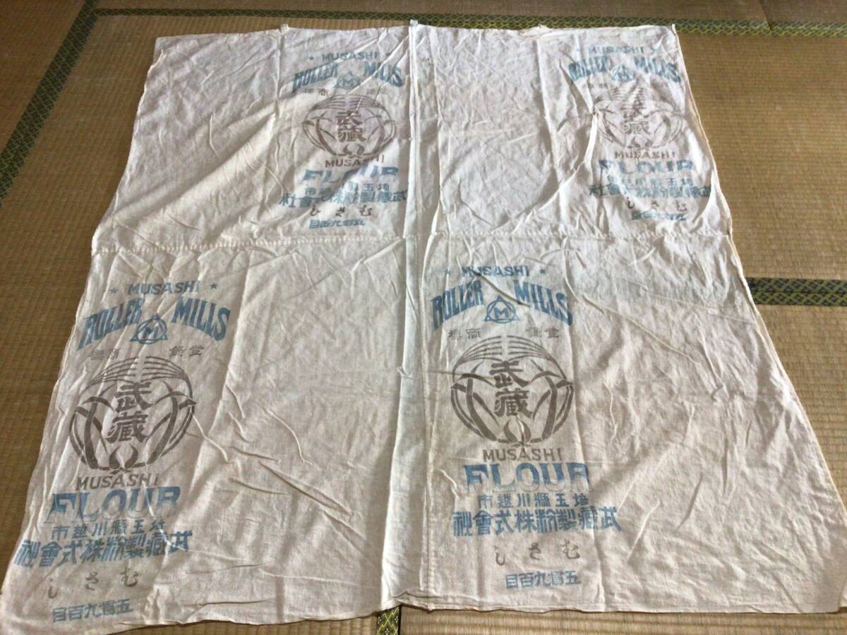 130×146,140×140センチあり、ザック織られた木綿です。粉袋を開いて4枚つないだ布です。傷みはありませんが薄シミがあります。