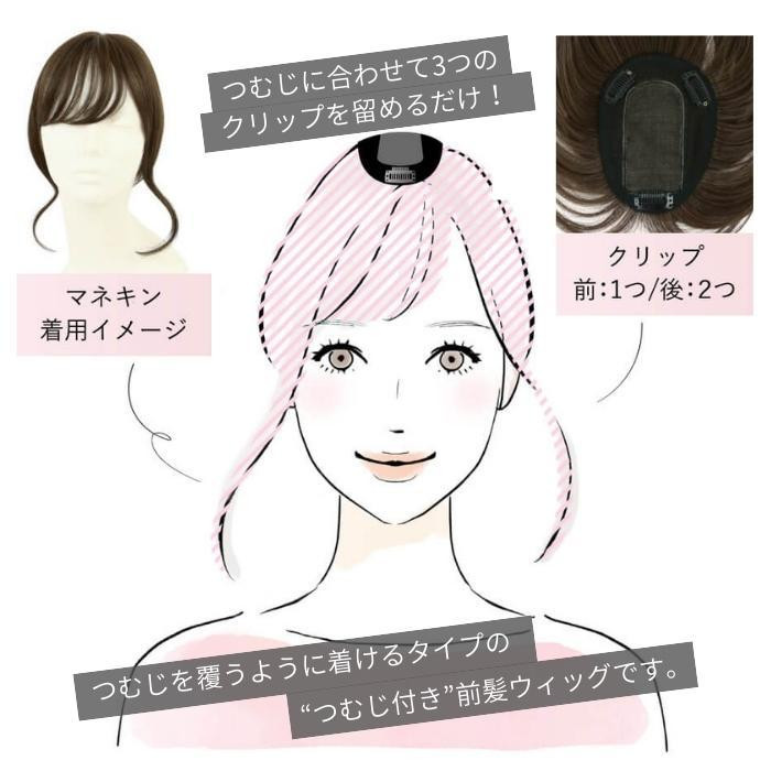 | 仕様 | ■ウィッグのタイプ マシンメイド前髪ウィッグ(つむじ有り) 自毛の前髪を両サイドに分けた上に着けるタイプの部分ウィッグ。 ■その他 人工スキン有り クリップ3個付き(前側:1個、後側:2個) |