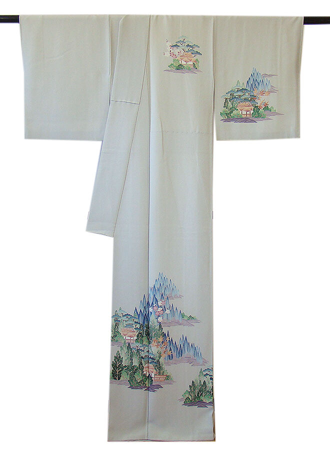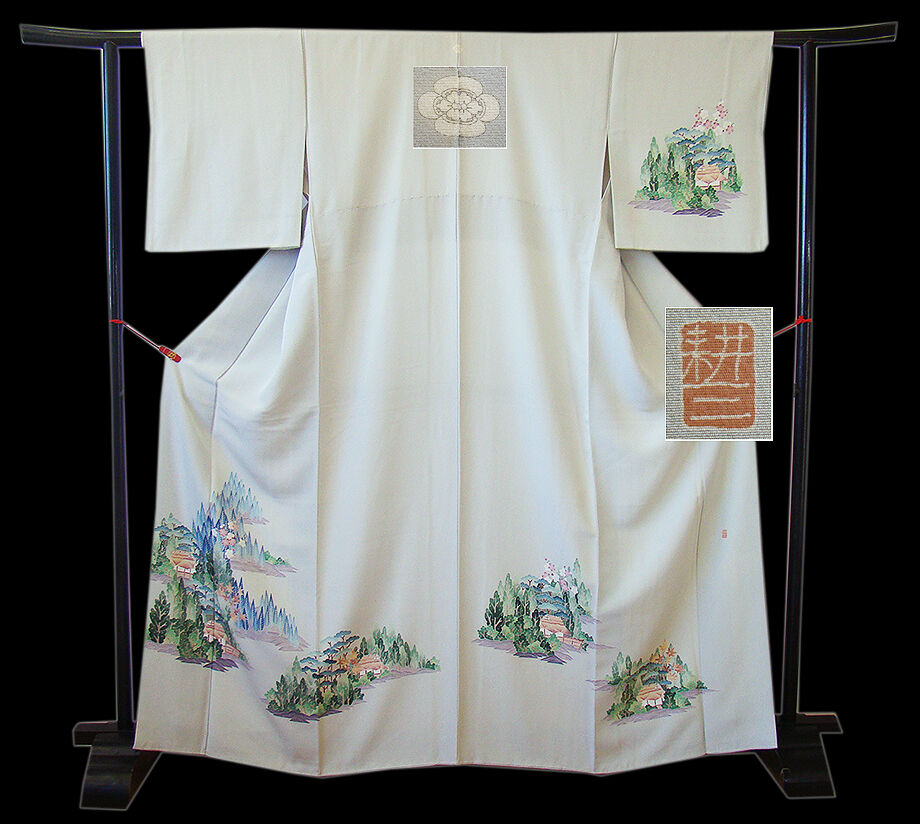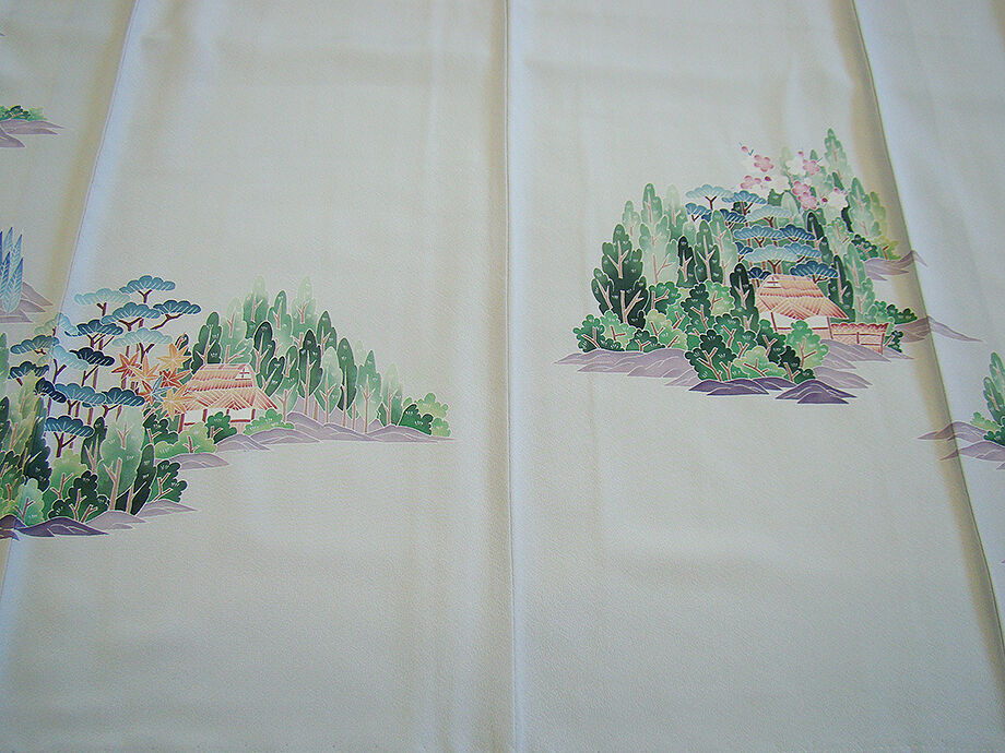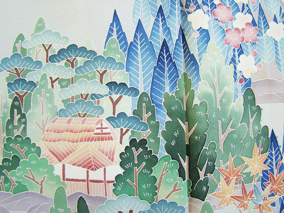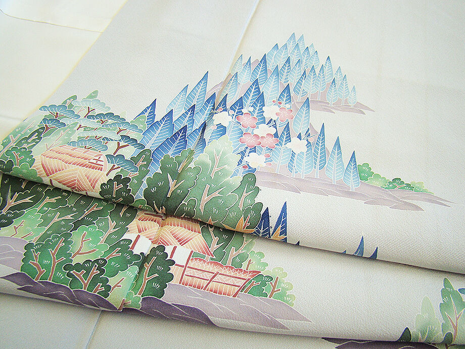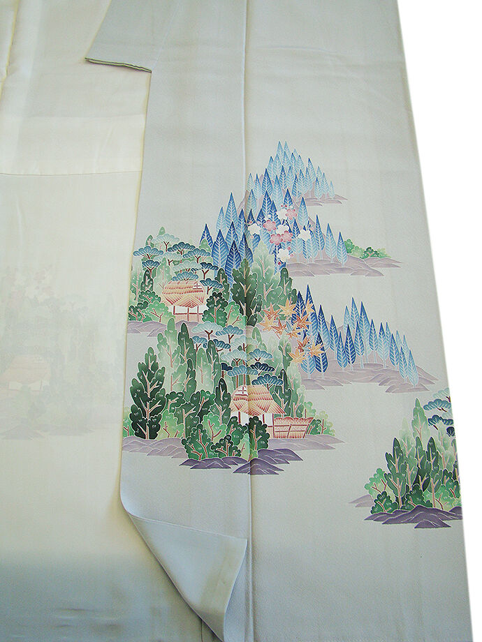 | ちょっと一言 | 一度は出逢い纏いたい加賀友禅作家、「森田耕三」作の気品に満ちた高級訪問着です。 写実的な絵画調が優しさや穏やかさを醸す様な優美な着物姿を謳い、あらゆる フォーマルシーンに映える美しい重厚感溢れる秀逸品です。 着る人には優しさを見る方には幸せを与えてくれる様な清々しい空間美に誘うお品です。 最高級の染めをご堪能頂け四季の花木が見事に咲き誇り、優美な代物となっております。 加賀友禅の特徴は、加賀五彩といわれる暖かな色彩に花鳥山水を描いた絵画的な構図、 模様の外側から内側へぼかしをいれる技法、虫食いの表現等、写実性を重視した染の技法です。 |