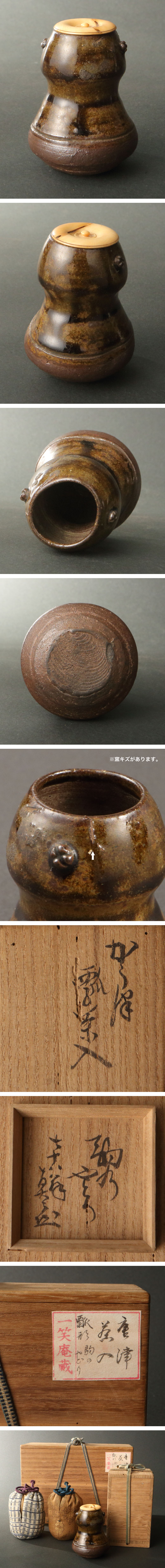 【深和】時代◆唐津耳付瓢形茶入 藪内真々斎書付 銘「駒のやどり」一笑庵旧蔵(唐津茶入 瓢箪茶入 茶器 数寄者 茶道具 宗匠 藪内流) 收藏