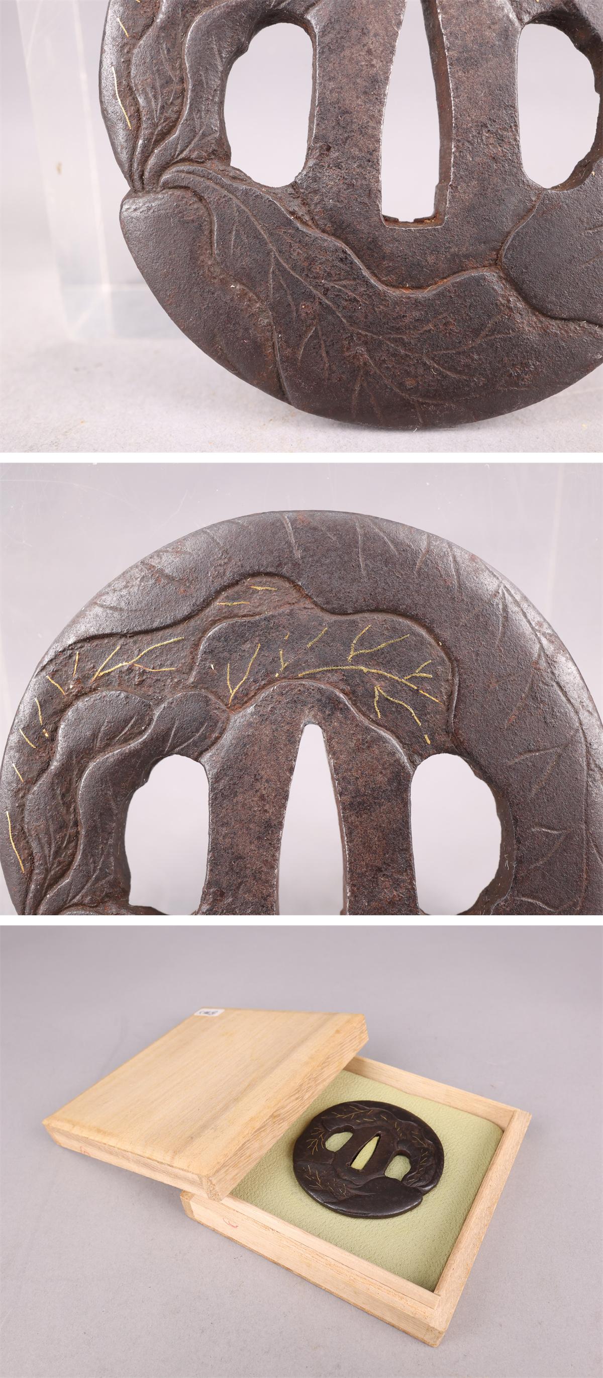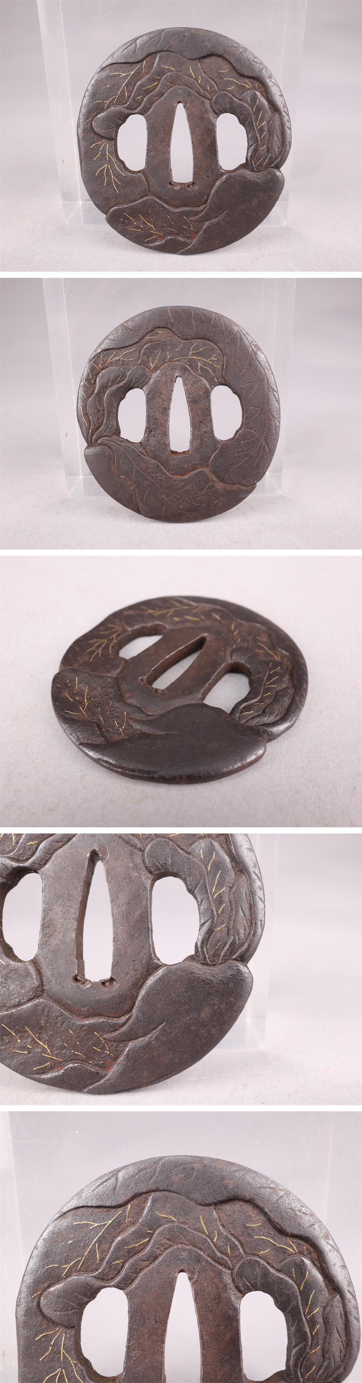 【志】A742 鍔 無銘 銅製 花草文 金象嵌 幅7㎝ 重105g 箱付 % 收藏