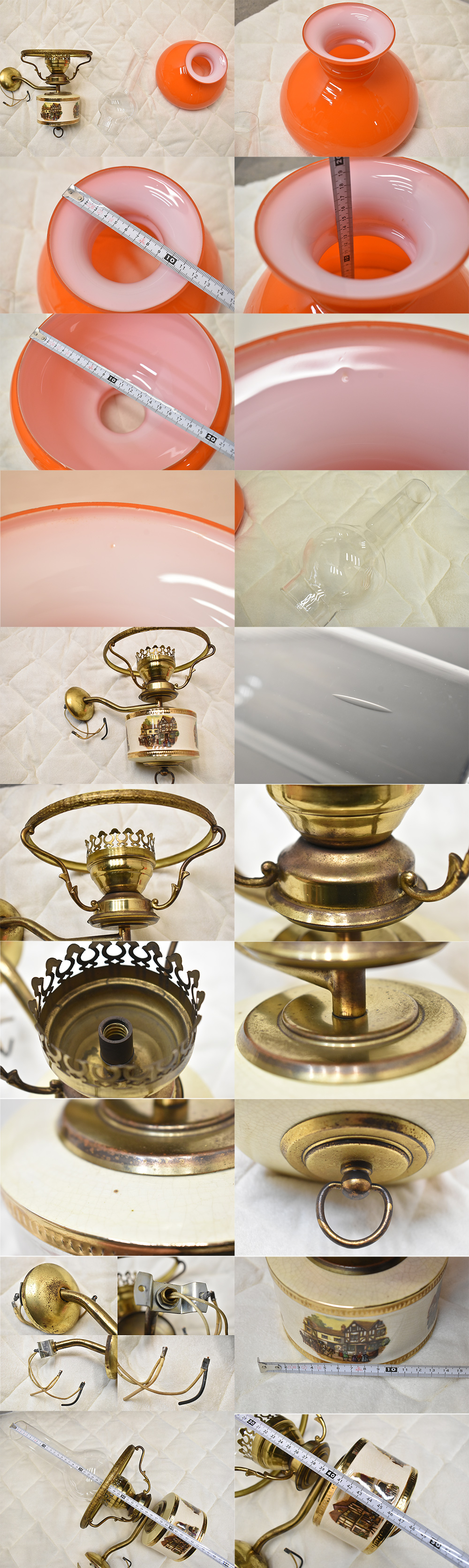 ☆アンティーク/ブラケットライト/ウォールライト/ウォールランプ/壁付照明/オイルランプ型/壁面灯/間接照明/陶器/点灯確認済/要工事の出品になります。 こちらの商品オイルランプ風の形をした照明になっています。 陶器の部分にかわいい絵柄があり、装飾金具もおしゃれな造形になっています。 その他画像にあるものはイメージとして用いたもので付属品ではございません。 画像にある電球は付属しませんのでご了承ください。 ※※※※※※配線がむき出しになっている商品ですので、取り付けには電気工事が必要です。※※※ お客様自身で専門の業者さんへ依頼していただく必要があります。 コンディション ランプ芯部分のガラスに1本大きなシワがあります。こちらはガラスの製造工程でできるものでガラスの特性でありヒビではありません。(本文中の画像参照) その他は特に大きな傷や・大きな汚れ等は見受けられませんでしたが、見落とし等ある場合もございますのでご了承ください。 詳細については画像にてご確認ください。 現状でのお渡しとなります。 状態は画像をよくご確認のうえご判断ください。 画像に写っているものが全てです。 画像にある電球は付属しませんのでご了承ください。 画像は目立つ部分を抜粋して掲載しております。 撮影状況や光の加減で画像の色合いが現物と異なる場合があります。 状態は画像をよくご確認のうえご判断ください。 ご購入前の質問には出来るだけお答え致しますが、ご購入後の返品はお受け出来かねます。 ご購入は慎重にお願い致します。 ご購入の際はプロフィールをご確認ください。 上記の点にご理解いただける方のご入札をお願いいたします。 サイズ 本文中の画像参照 多少の誤差はご了承ください。 色 本文中の画像参照 自社商品評価 B 評価判断基準 ・S 新品。若しくは未使用品。 ・A+ 新品同様品。傷や使用感がほとんどなく、非常に綺麗な状態。 ・A 美品。小さな傷などはあるが気になるレベルではなく、綺麗な状態 ・B 良品。傷や汚れなど若干の使用感はあるが、大きな痛みがない状態 ・C 中古品。使用上の問題はないが、気になる傷や汚れなど痛みがある状態 ・D ジャンク品。使用の上で問題がある状態。コンディション欄コメントを参照 ※上記評価は弊社規定にて判断させて頂いたものになります。商品画像、説明文に出来る限り状態を記載させて頂きますのでよくご閲覧頂いた上、自社商品評価はあくまでも参考としてご判断頂けますようお願い申し上げます。 |
