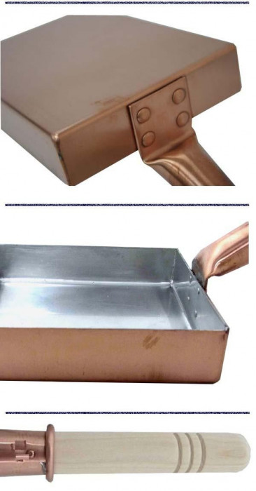 | 中村銅器製作所の卵焼き器は、銅板に厚みを持たせることで保温性が高くなり、焼きムラや焦げ付きが起こりにくくなっているのが特徴です。使用するほどに油がなじみ、一層使いやすくなります。また、柄が少し高くなっているため、鍋をガスコンロから外せば自然と頭が落ち、その分の反動をつけて卵を返せば、卵焼きを上手につくることができます!! ※こちらの商品は手作業で製作しているため、若干のサイズ誤差が生じる場合がございます。予めご了承ください。 【最初にご使用になる前に】 食器用洗剤をつけたスポンジで洗って、水でよく流し完全に乾かします。 その後、鍋7分目を目安に油を入れて火にかけ、弱火で4~5分煮てください。 (鍋から目を離さぬよう注意してください。) こうする事で油が鍋になじみ、焦げ付きを防ぎます。 煮終わった油には不純物が浮き上がる事があるので、完全に冷めてからお捨てください。 【お手入れ方法】 ●鍋が冷めてから、キッチンペーパー等で内側のくずを取り除き、薄く油を引いて収納してください。 ※油が鍋になじみ、一層焦げ付きにくく使い勝手のよい鍋になります。 ※油が気になる場合、又はしばらくご使用にならない場合には軽くスポンジで洗い、次回使用の際に油馴らしをしてください。 ●外側は、食器用洗剤等を使用してスポンジで洗ってください。 ●焦げ付いた場合、鍋に水を入れ火にかけ、沸騰させた後にスポンジで洗って最初に使用するときと同じように油で煮てください。たわし、クレンザーなどでこするのはおやめください。傷つきの原因になり、またその部分が焦げ付きやすくなります。 ●長期間ご使用にならない場合は、油を引いた後にキッチンペーパー等を内側に引き、かぶせておくことにより長持ちします。 【ご使用上の注意】 ●空焚きは絶対にしないでください。 ●銅は熱伝導率が非常に高いため、火力は弱め(中火~中火以下)に調整してください。 ●内側(銀色の部分)は、たわし、クレンザー、金属製の器具をご使用にならないでください。 ●持ち手がゆるんだ状態でのご使用はおやめください。 ●持ち手部分が熱い時には、鍋つかみ等をご使用ください。 ●鍋の中に調理物を長時間保存しますと錆びの原因になりますので、調理後はすぐに調理物を他の器に移してください。 |