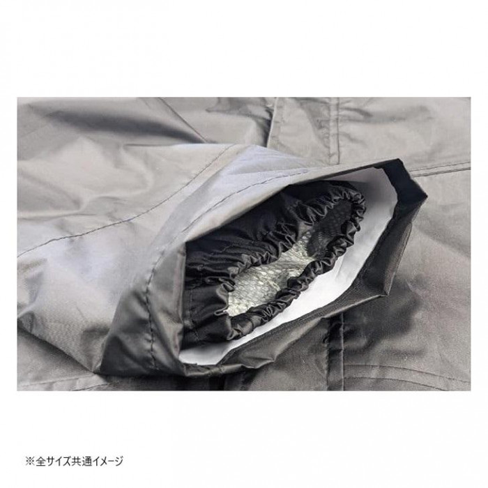 | 仕様 | 耐水圧:15000mm(初期値) 透湿度:5000g/m2・24h(初期値) ・防水加工 ・撥水加工 ・透湿素材 ・ビニル付着脱式フード ・前後反射プリント ・深型二重袖 ・ウエスト調節 ・両腰ポケット ・足裾調節(クロスナップ) |