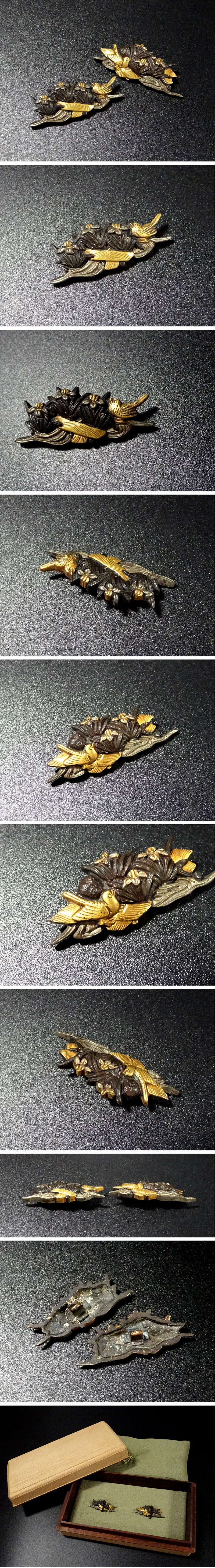 敬逢 秀逸 刀装具 菖蒲に鳥図目貫 無銘 赤銅地 容彫 金銀象嵌色絵 極上細密細工 化粧箱付き 侍 SAMURAI TST-41 收藏