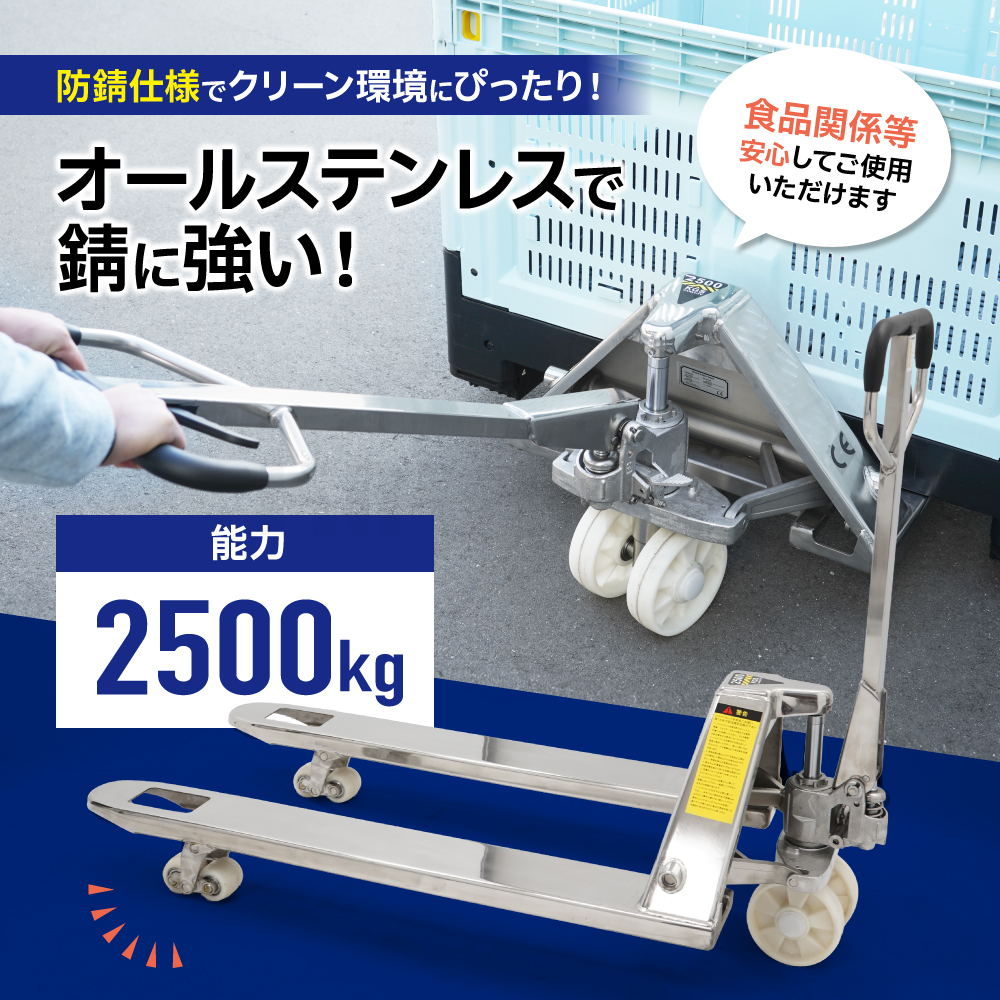 防錆仕様でクリーン環境にぴったり! 部品もステンレスなので食品関係などの使用でも安心 ●オールステンレスで錆によるトラブルがなく、安定して長くお使いいただけます ●フォークの全幅が685mmなので安定感があり、幅の広いパレットにも対応 ●ダブルフォークローラーなので段差に強く、重い荷物でも動き易くなっています ●フォーク先端にトウローラー(補助ローラー)が付いているので、 パレットに挿し込む際の段差をスムーズに越えられます ●ステアリング/フォークローラーともナイロン製で、湿った環境にも適応します ●食品業界などの衛生管理が重要な場所での使用に最適です ●下降用フットペダル付き ●工業製品国際規格CEマーク取得の一級品です |