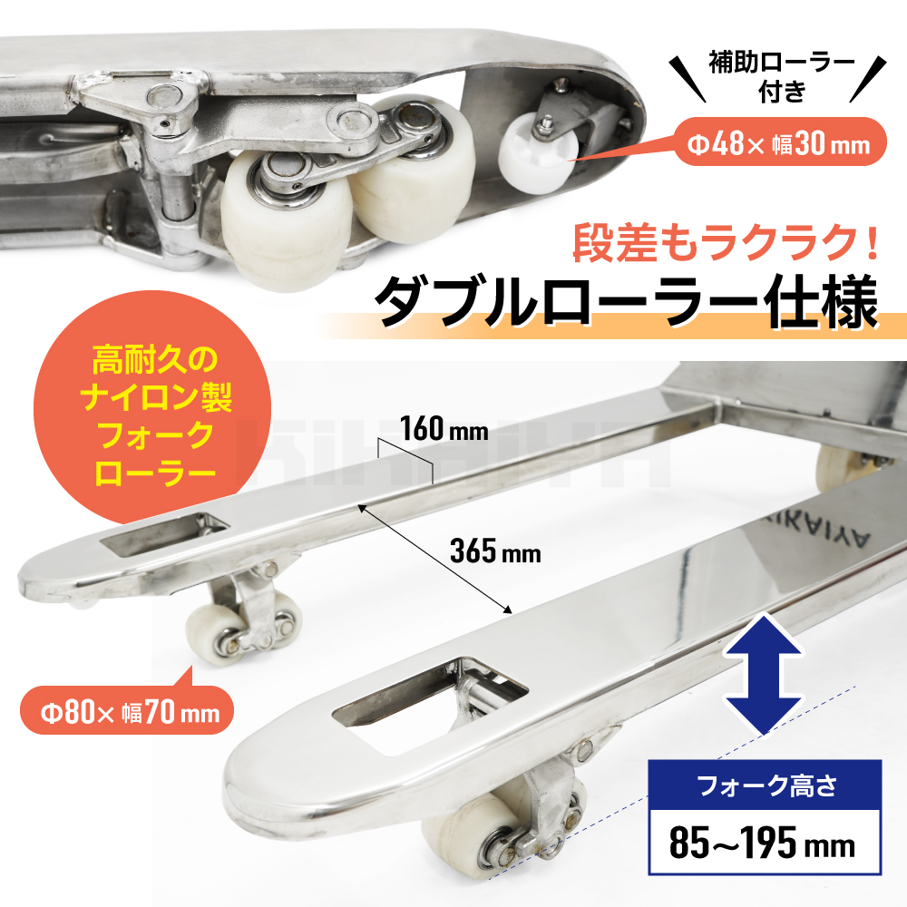 ステンレス ハンドリフト 2500kg ダブルローラー SUS304 ワイド ロング フォーク長さ1220mm 全幅685mm 業務用 收藏