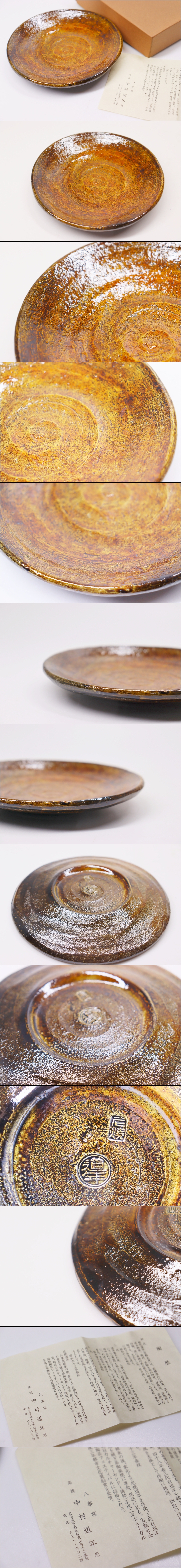 茶道具 名工 中村道年 作 楽焼 飴釉 丸皿 菓子皿 菓子器 栞 紙箱 八事窯 尼焼 / g381 收藏