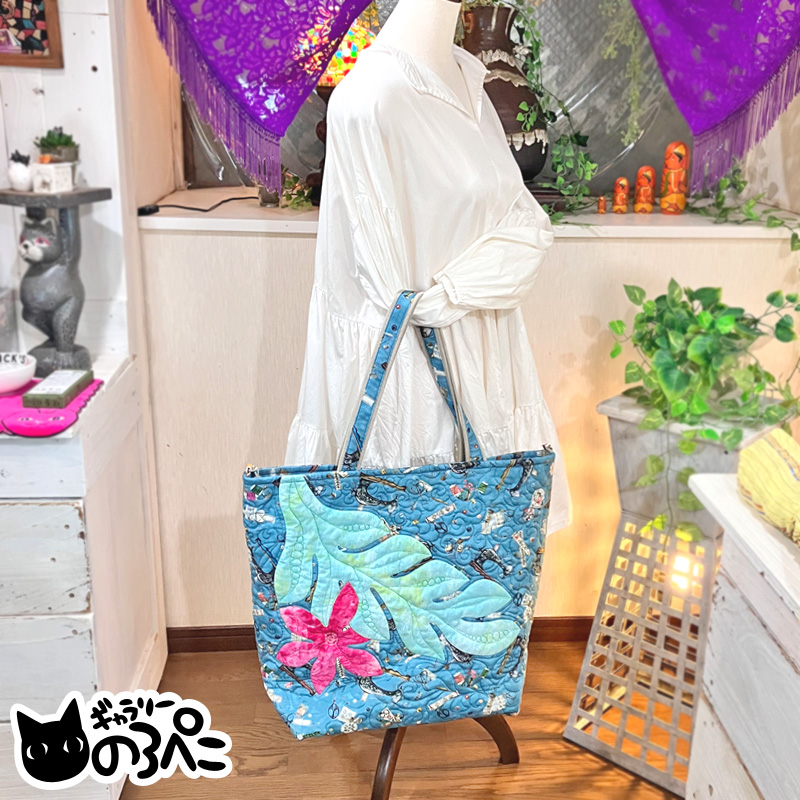 赤い花と葉っぱときらめく自然の大きめキルトバッグ(オリジナルパターンで仕上げたミシン&フリーモーションのキルトバッグ) bc843-126 收藏