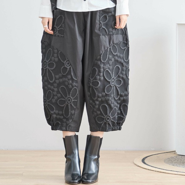 【新品】フラワーアップリケ バルーンパンツ ウエストゴム イージーパンツ ゆったり 体型カバー アート柄 N53-042 收藏