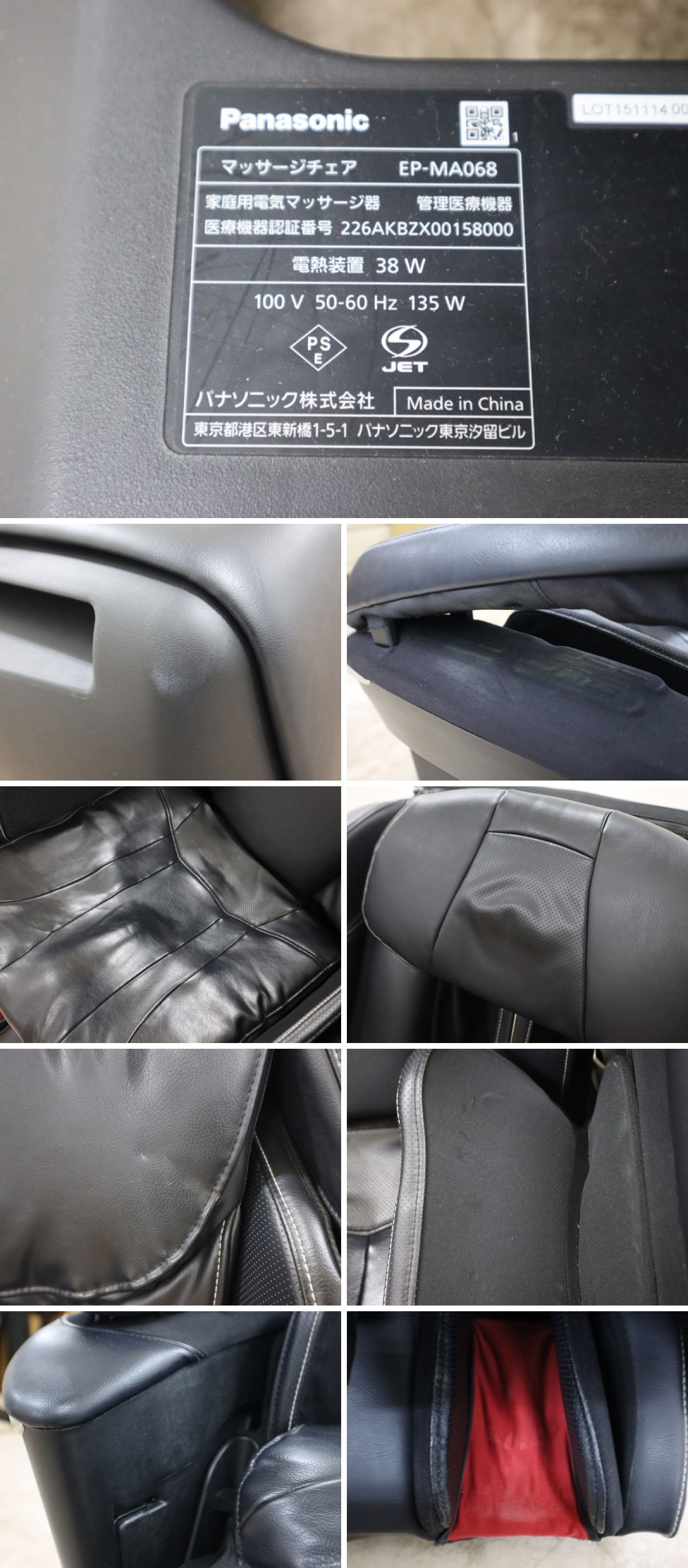 【仕様】 型番:EP-MA068 張地:合成皮革 電源:交流100V 50-60Hz 本体寸法:リクライニングしていないとき/高さ約115×幅約90×奥行約122cm、リクライニングしたとき/高さ約72×幅約90×奥行約202cm 本体質量(重量):約85kg リクライニング角度:背もたれ/約120度~約170度、脚のせ台(脚・足裏マッサージ部)/約5度~約85度、脚のせ台(フラット部)/約15度~約95度 消費電力:135W(操作器で電源「切」のとき約0.3W) カラー:ブラック系(画像は100%正確では御座いませんので気になるお客様は世田谷区船橋の倉庫でご覧頂けます。色味による返品、返金は一切お受けできませんのでご了承の上、ご入札をお願い致します) |