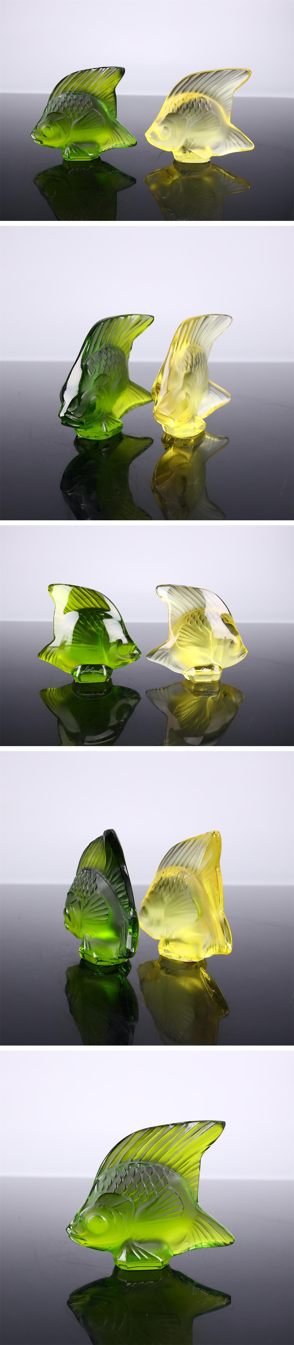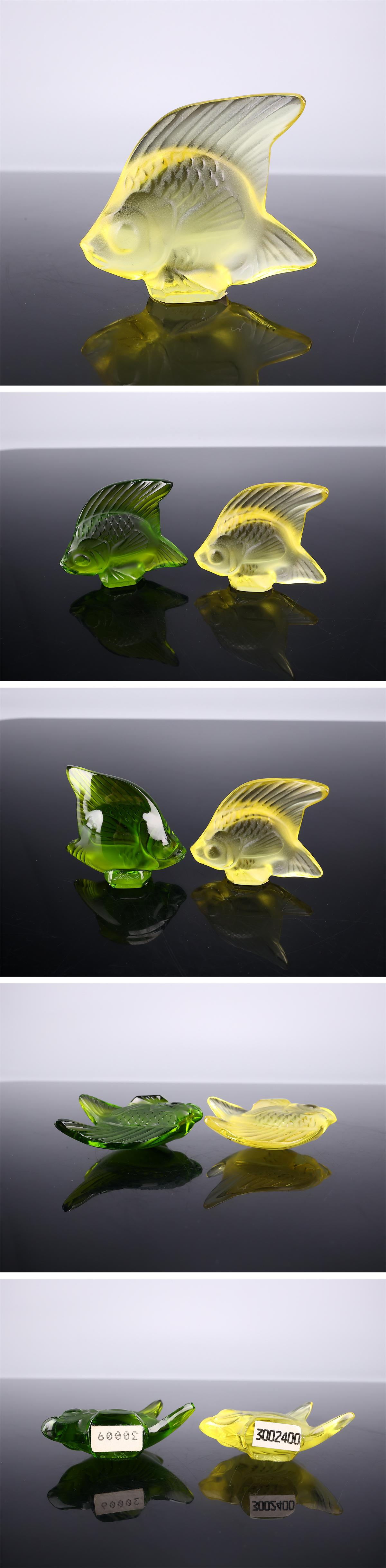 【吉】PE001 Rene Lalique 【ルネ・ラリック】 クリスタルガラス 黄緑ガラス 金魚 小置物 2点 一対/美品t! 收藏