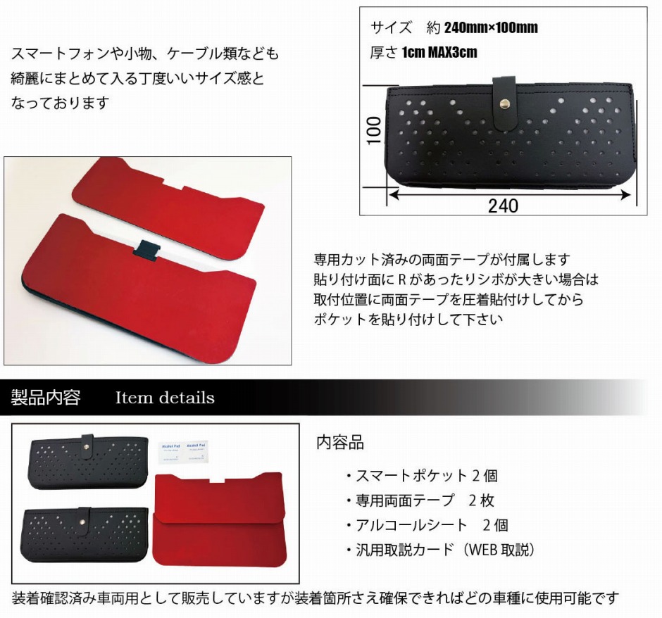 | ・スマートポケット×2 ・両面テープ×2 ・アルコールシート×2 ・取説カード(WEB取説) |