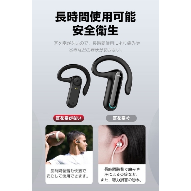 ご覧いただきありがとうございます。 商品名:耳掛け式 ワイヤレスイヤホン 【この商品が品質で選ばれる理由】 軽快な装着感と安定した通信性で、安全に高音質を楽しめるからです。 ■こんな悩みありませんか? イヤホンを長時間使用すると耳が痛くなる、疲れてしまう。 通話や音楽を聴いていると途中で音が途切れてしまう。 外出先で急な雨に降られたり、汗をかいたりしても大丈夫か心配。 ★こんな時におすすめ! 長時間の移動やテレワーク、オンライン会議で集中したい時。 スポーツやジョギングなど、体を動かしながら音楽を楽しみたい時。 外出中に充電切れを気にせず、長時間使いたい時。 ------------------------------------- 【軽快に装着できる耳かけ式】 ・イヤーフックが付いており、耳にかけて使用するワイヤレスイヤホンです。 ・耳を塞がないため、圧迫感が少なく快適に使用できます。 ・着脱もしやすく、ヘッドホンよりも手軽に使えます。 【耳を塞がない新体感】 ・周囲の音も聞こえるため、閉塞感がなく安全性が向上します。 ・まるで「音楽を身にまとっている」かのような、心地よい「新体感」を提供します。 【安定した通信と高音質】 ・最先端のBluetooth 5.2規格を採用し、音飛びや途切れが起きにくいです。 ・高忠実度サウンドとHi-Fi高音質で、音楽を快適に楽しめます。 【その他の特徴】 ・ハンズフリー通話に対応しており、テレワークにもおすすめです。 ・充電ケースが付属しています。 ・iOS、Android、Windowsシステムに対応し、幅広い互換性があります。 ・日本技適マークを取得済みです。 【付属品】 ・イヤホン+充電ケース ・充電ケーブル ・日本語取扱説明書 ご不明な点などございましたら お気軽に「質問する」からお問い合わせください。 |