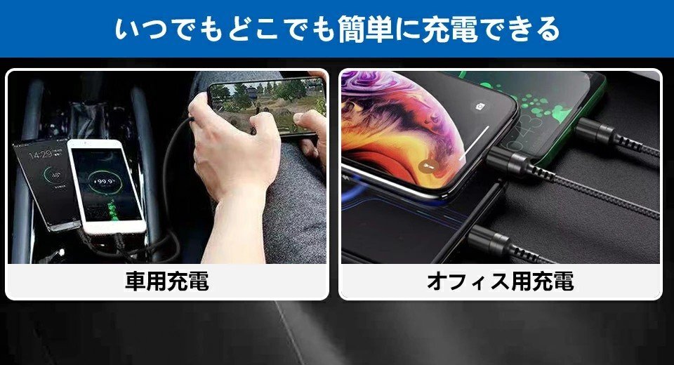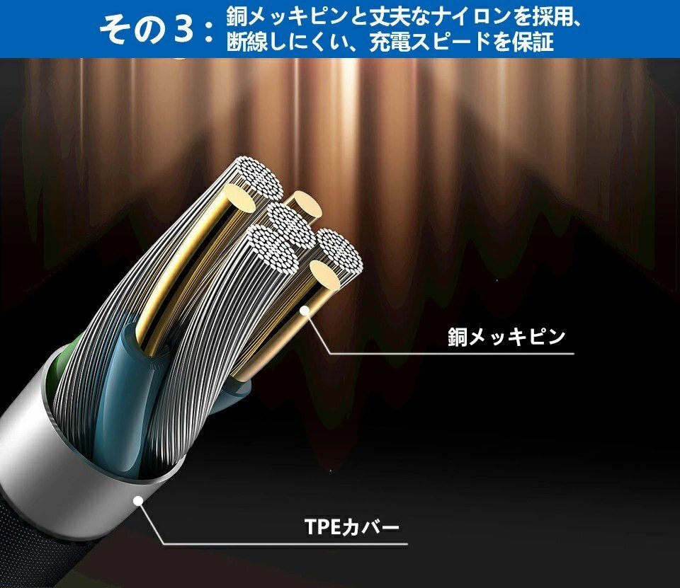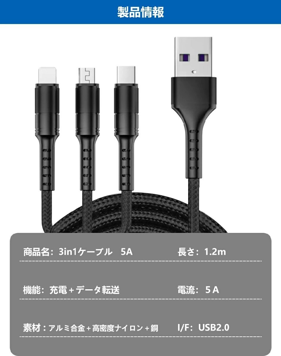 充電ケーブル 3in1 急速充電 iPhone 充電ケーブル Type-C ライトニング Micro USB 5A 1.2M 編組ナイロンiOS Android iPhone iPad Macbook 收藏