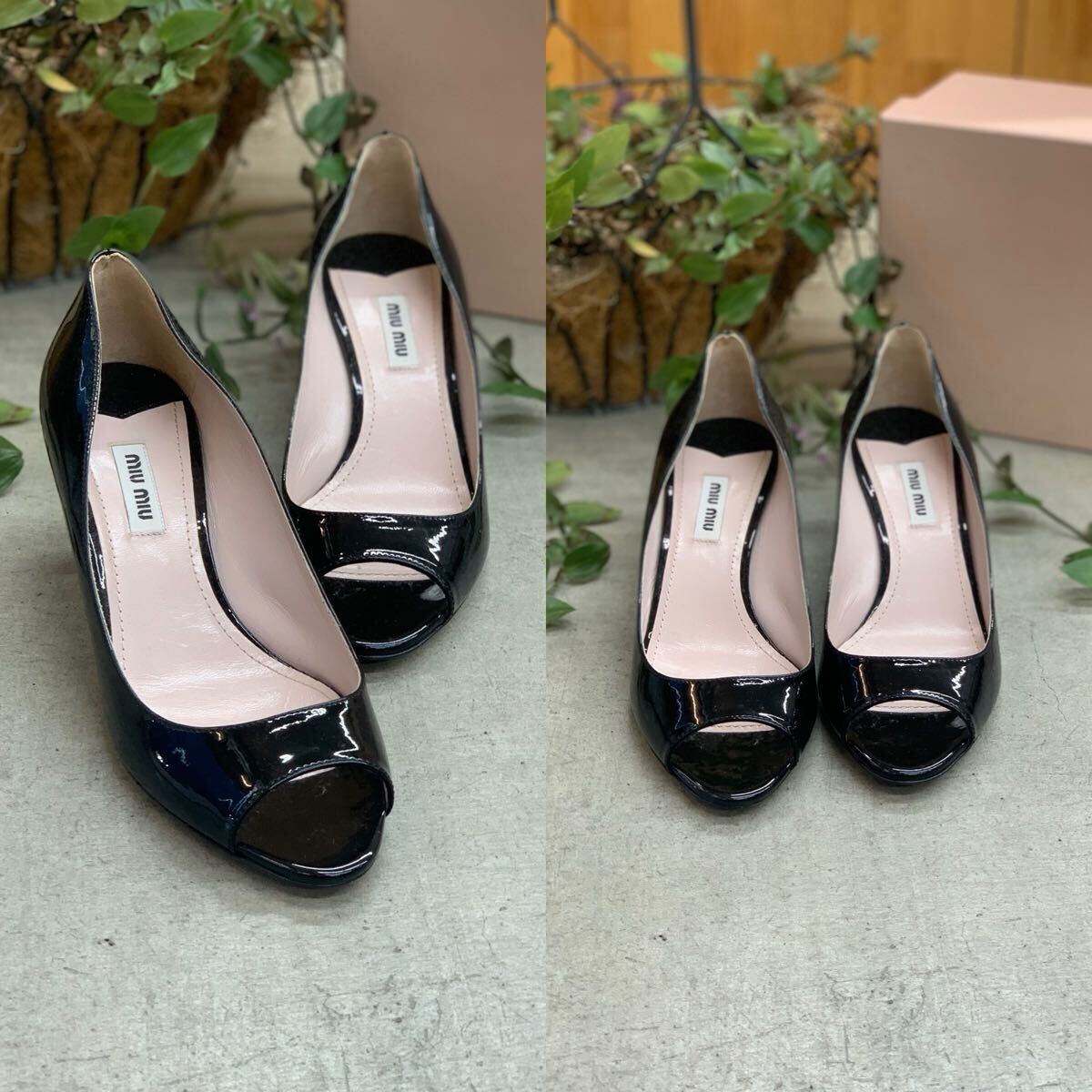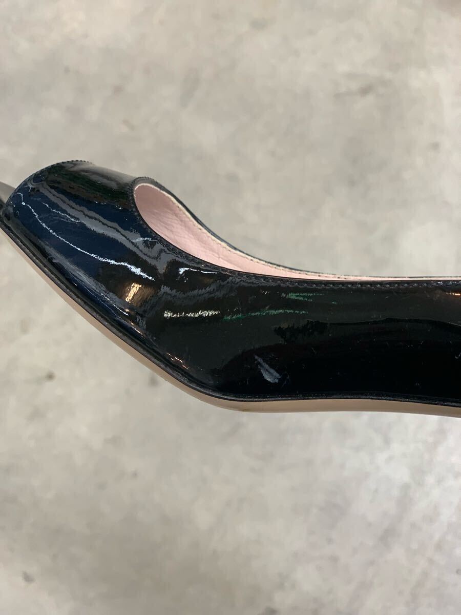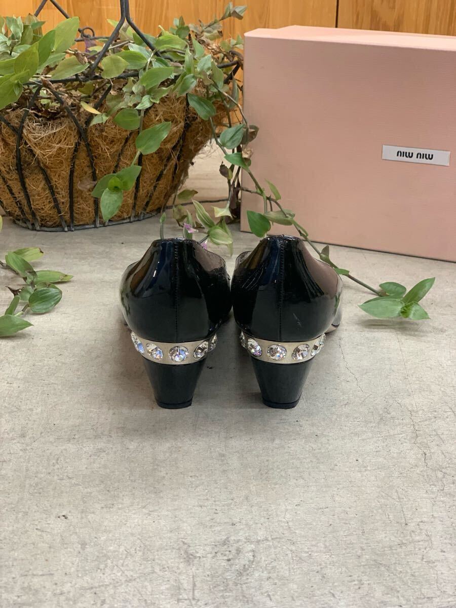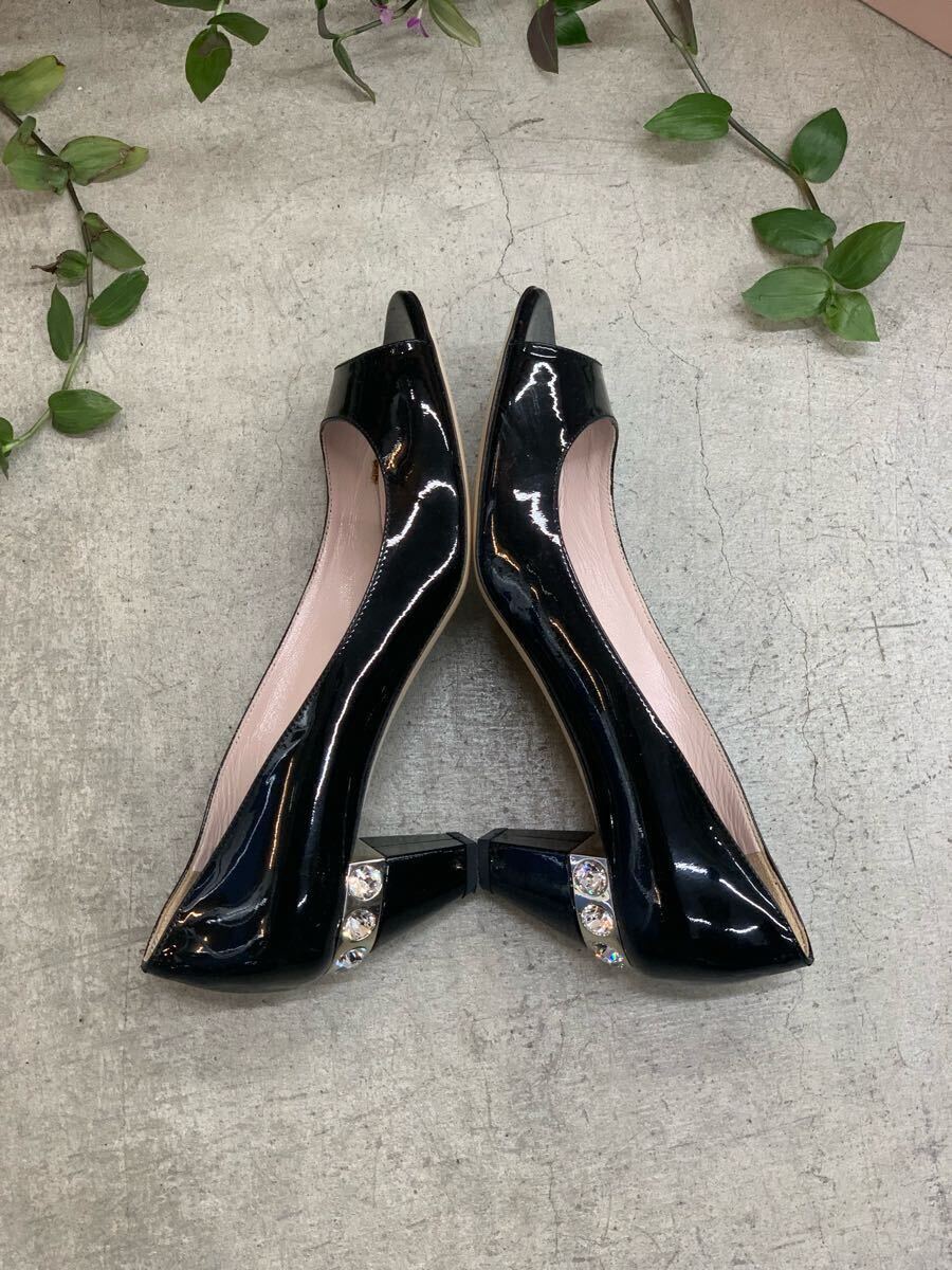 美品 MIU MIU ミュウミュウ ラインストーンエナメルオープントゥパンプス パテントレザーキューバンヒール ビジュー ブラック黒色系 37 h 收藏