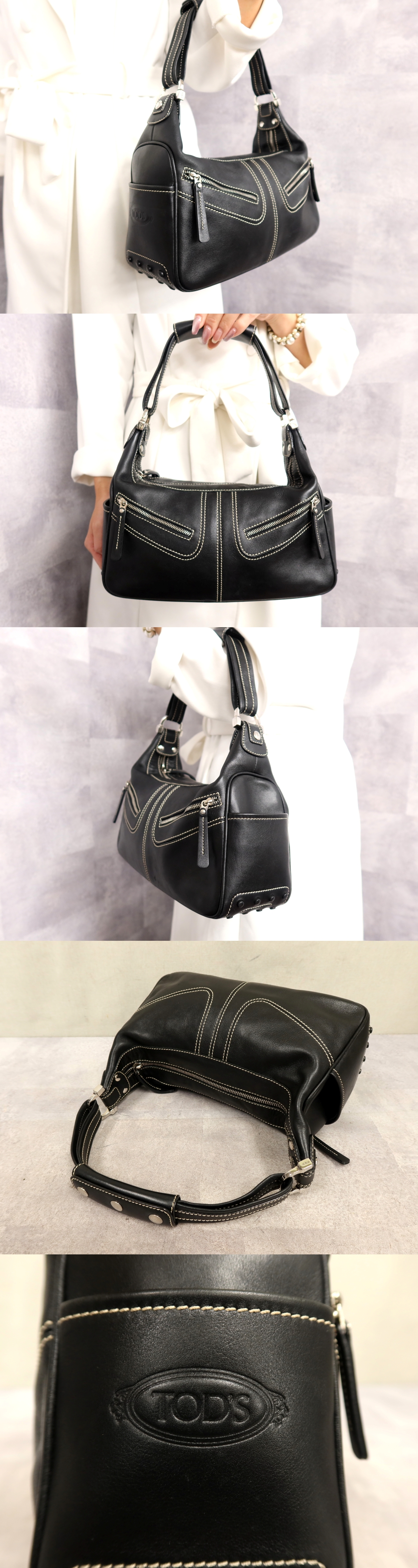 ●超美品●TODS トッズ●ロゴ型押し●ステッチ●カーフ レザー 本革●ハンド バッグ●黒●シルバー金具●腕掛け●かばん●Js61955 收藏