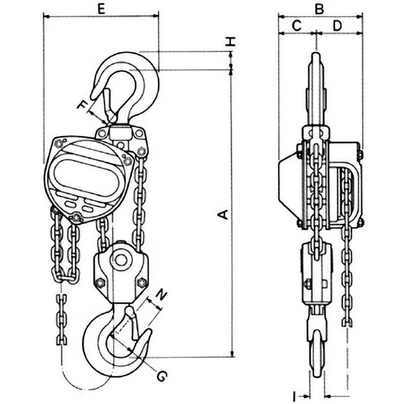 ■メーカー 象印チェンブロック ■品名 チェンブロック スーパー100 / 5t ■詳細 定格荷重(t):5 揚程(m):3 トロリー:無 フック間最短距離(mm):613 質量(kg):39.5 種別:手動 巻上平均手動力(N):343 手鎖線径×ピッチ(mm):5×23.6 ロードチェーン線径×ピッチ(mm):9×27 荷鎖掛数:2 荷鎖等級:V RoHS指令(10物質対応):対応 寸法H(mm)46 寸法F(mm)58 寸法D(mm)100 寸法E(mm)282 寸法B(mm)190 寸法C(mm)90 寸法N(mm)53 寸法I(mm)34 寸法G(mm)70 ![]()