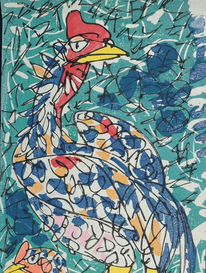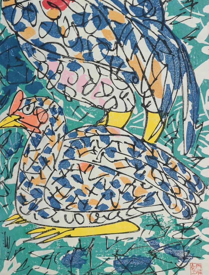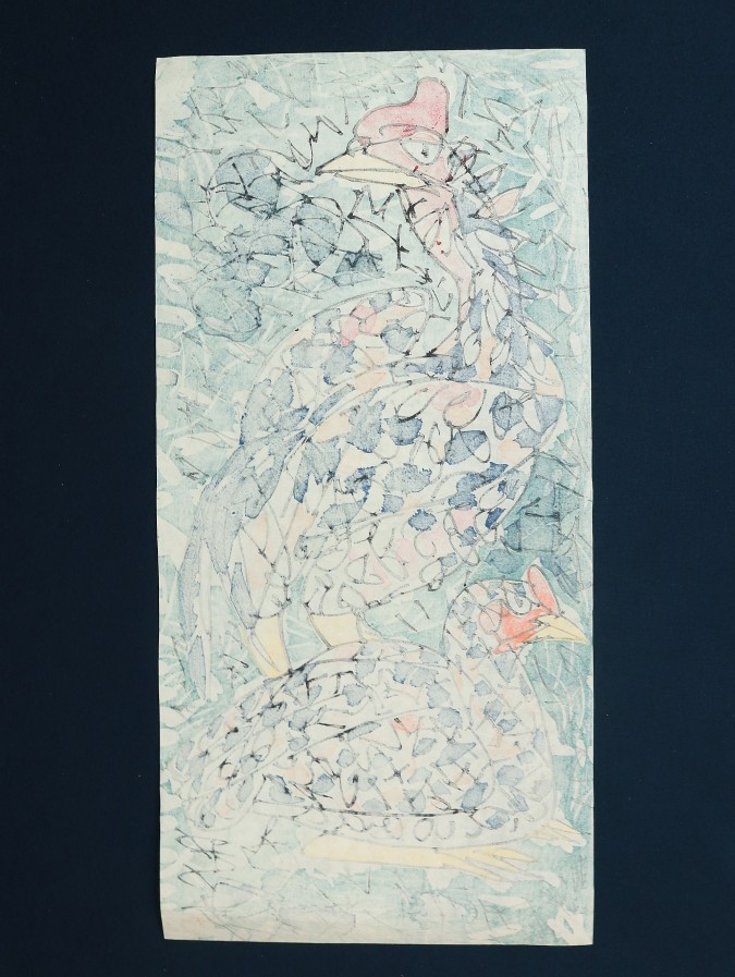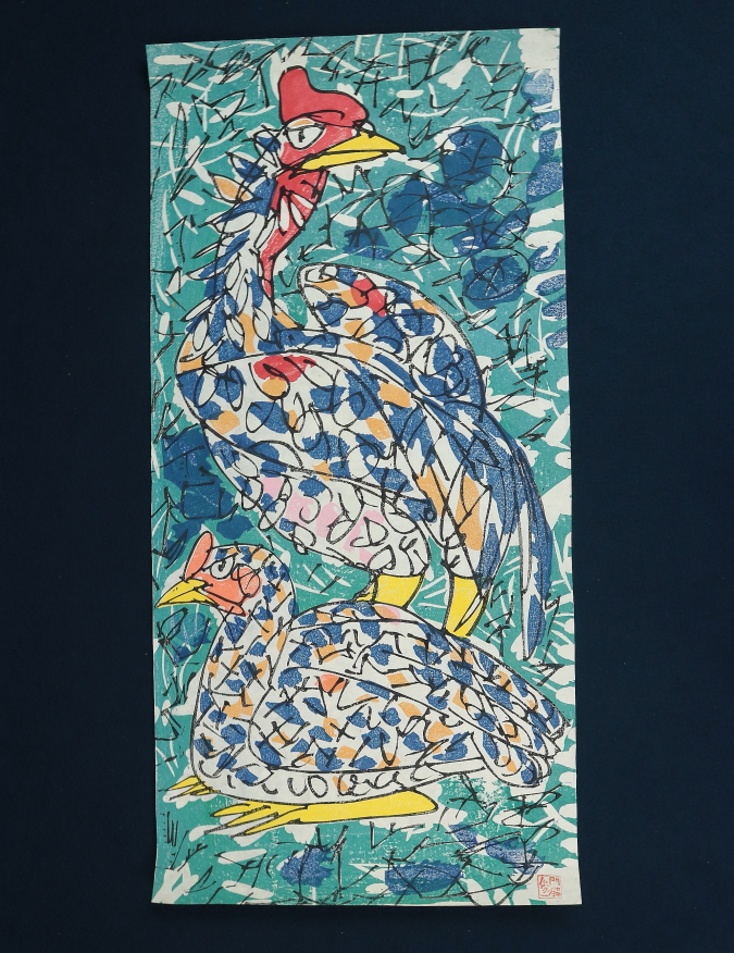 11749■【真作】門脇俊一 双鶏図 木版 現代の浮世絵師 香川の人 マクリ
