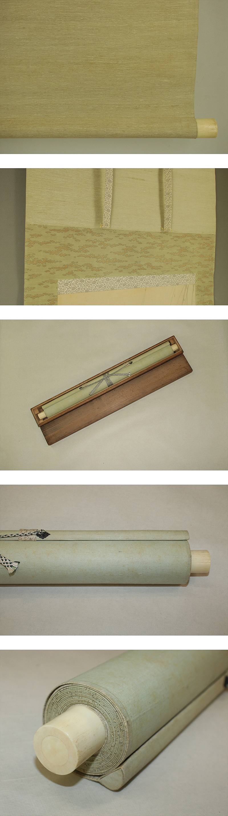 堂本印象 どうもと-いんしょう(1891-1975) 日本画家。京都の生まれ。本名、三之助。 初期から各種の技法を駆使し、仏画・寺院襖絵(ふすまえ)を手がけ、 第二次大戦後は日本画における抽象表現の追求へと向かった。文化勲章受章。 本紙は、染み、汚れ、軽い皺、ヤケがあります。 表装は、染み、汚れ、折れ、皺があります。 【サイズ】 作品 横約40cm×縦約123.5cm 表装 横約54cm×縦約208cm |