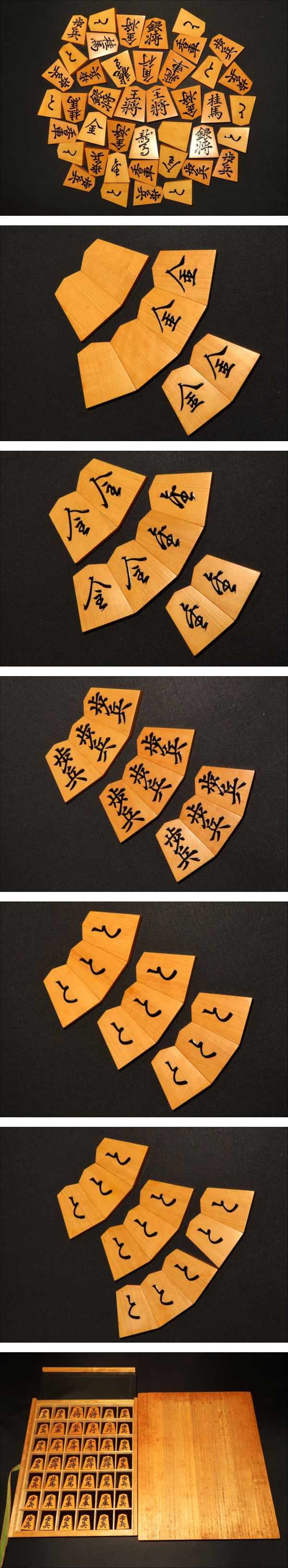 木地は御蔵島黄楊斑入上柾目。全ての駒の表裏をUPいたしましたので是非ご覧ください。