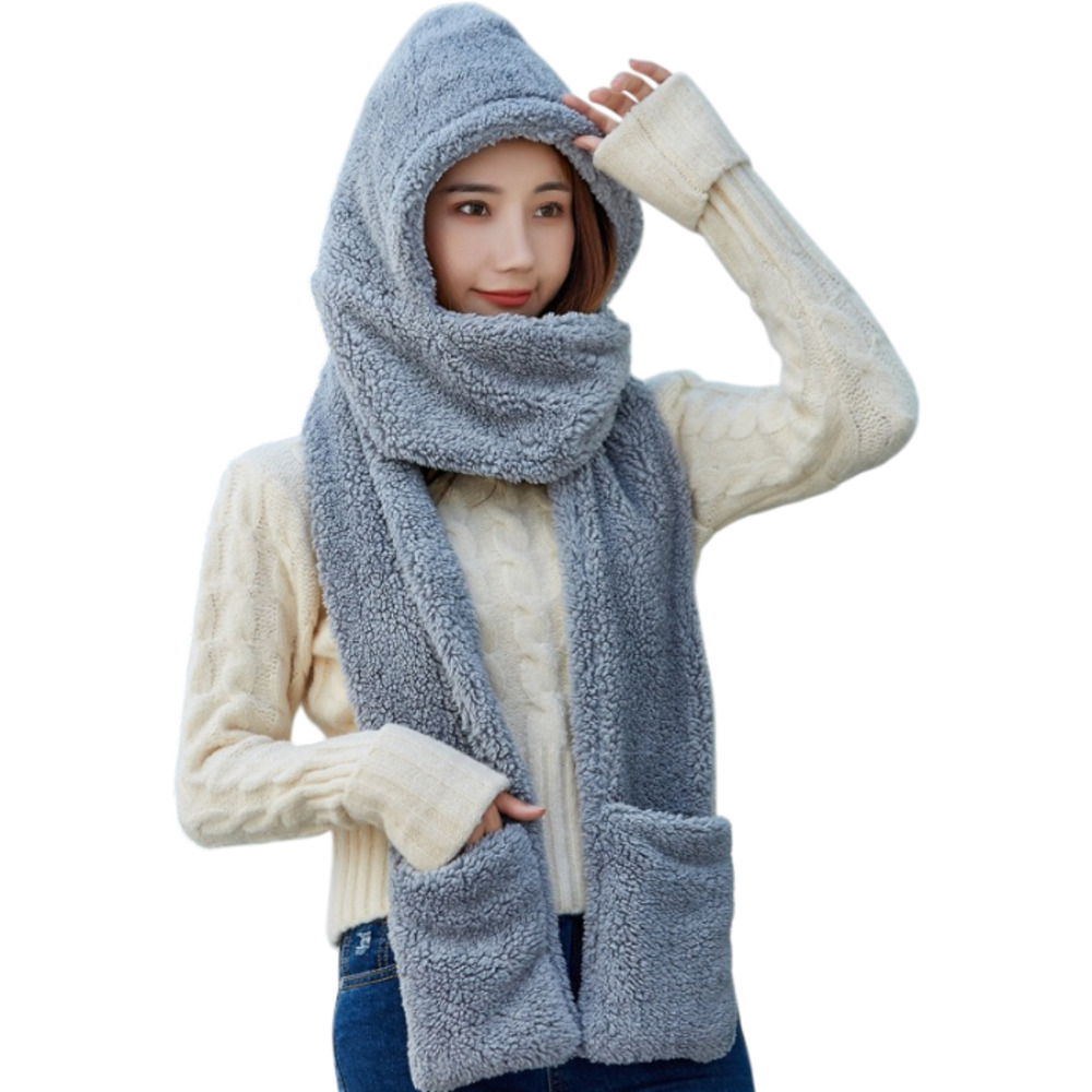 ☆ グレー ☆ フード付きマフラー 一体型手袋 ポケット レディース フード付きマフラー マフラー 帽子 ネックウォーマー 防寒 防風 保温 收藏