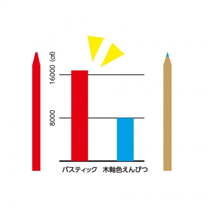 | 軽いタッチで、ムラなくきれいに塗ることができます。カスが出にくいので、紙や服が汚れにくく、細かいところもしっかり塗れます。ぺんてる独自の特殊配合で、グラデーションや重ね塗り、つやだしが綺麗にできます。色同士が自然になじみ、より自然な立体感を表現できます。木軸の色えんぴつの約2倍塗れます。塗れる面積は、畳約一枚分です。 |
