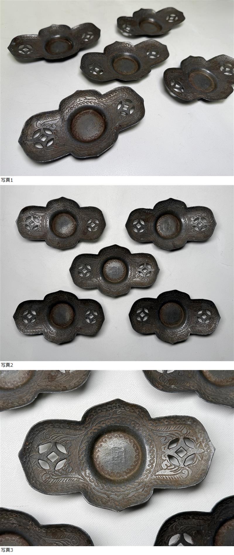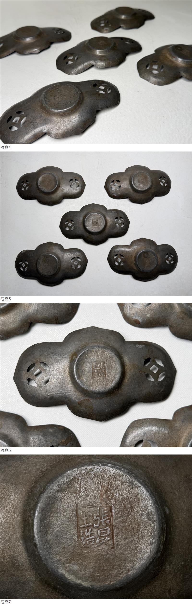 003 時代物 唐物 古錫 茶托 張昆玉造 5客 256g 検索:(茶道具 煎茶道具 錫 托子 木瓜式 中国美術 古玩 金属工芸) 收藏