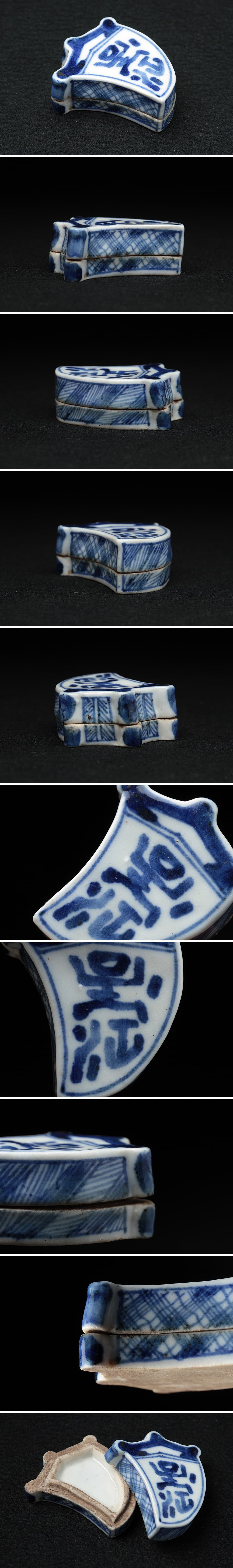 | ◆ 時代茶道具 大明成化年製 青花 古染付 丁子形香盒 幅5.7cm 木箱附・青花呈江字紋香合・蓋物・盖盒 明 清 中国古玩 ◆