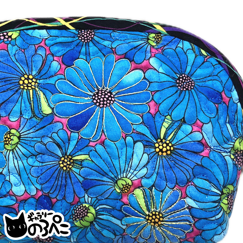 青い花のフリーモーションキルトポーチ(青い花柄USAコットンをフリーモーションで仕上げた大きめポーチ) bc843-119 收藏
