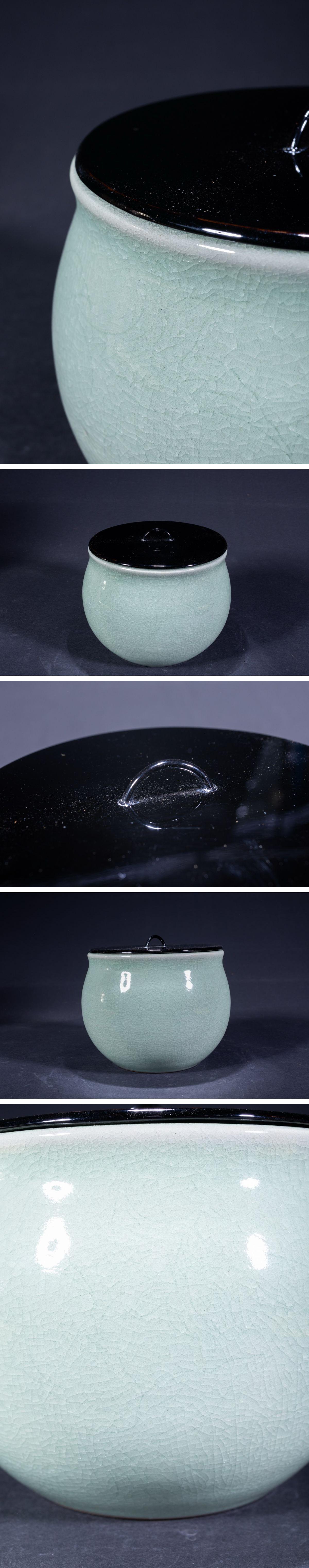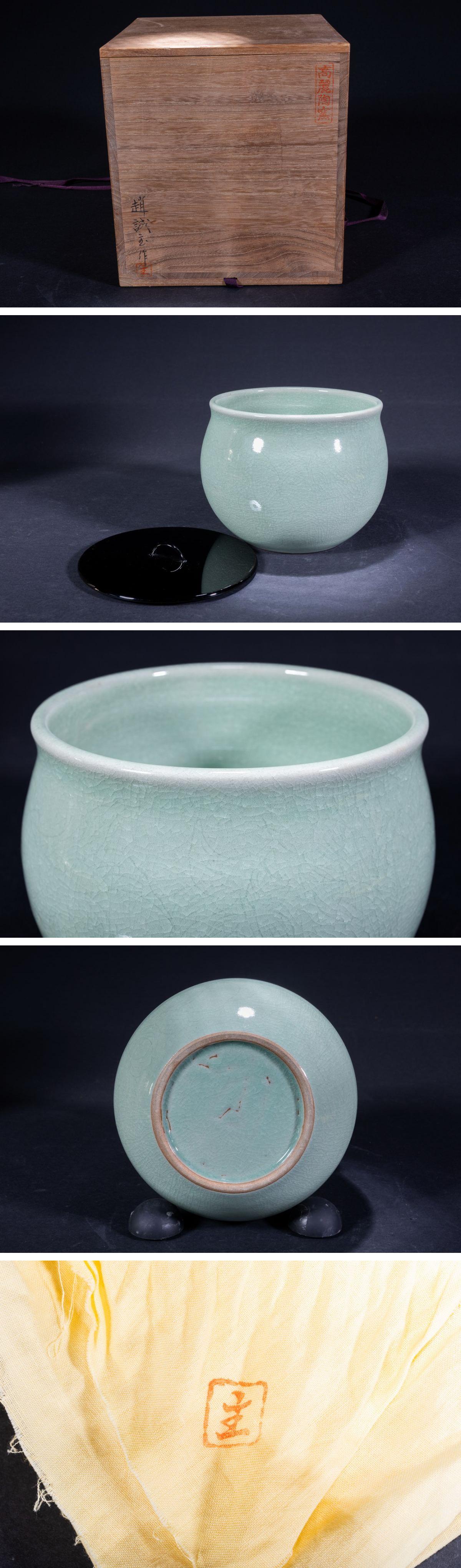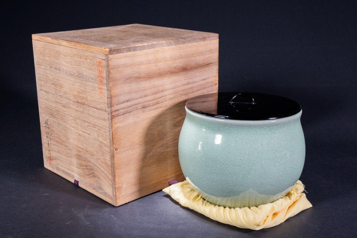 【珍品堂】1円から 趙誠主 作 在銘 水指 茶道 青磁 共布 木箱 蓋付 茶道具 径18.4cm N-A66D-CG2 收藏