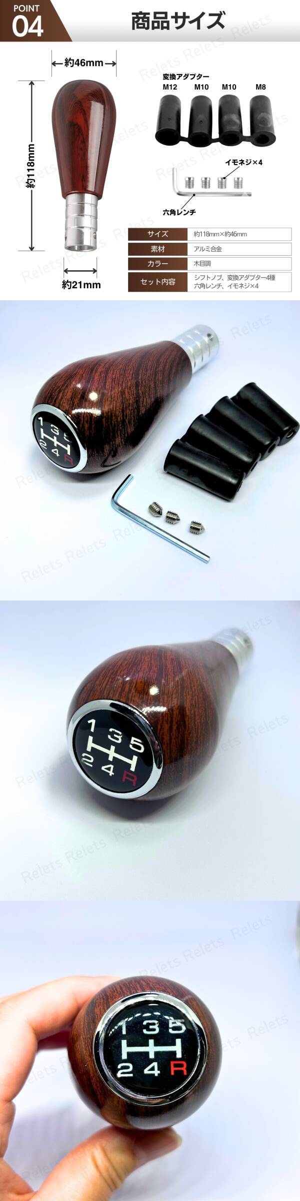 | 商品説明 | ご覧いただきありがとうございます! ウッド調シフトノブ Bタイプ(MT車 5速対応) ●商品説明 愛車のインテリアを上質に仕上げる ウッド調デザインのシフトノブ です。 高級感のある木目調は旧車から現代車まで幅広くマッチし、車内の雰囲気をグッと引き締めます。 手に馴染むちょうど良い太さで操作性も抜群。 シフトチェンジが快適になり、ドライブがより楽しくなります。 また内部に空間があるため、お好みで鉛などを入れて重量調整も可能。 細かなドライビングフィーリングにこだわりたい方にもおすすめです。 ●取り付け方法 ①付属の変換アダプター(M8 / M10×2 / M12)を車両側のシフトに取り付け ②本体を装着したら イモネジ3点止め で固定 ◎幅広い車種に対応しています。 ※使用しているうちにイモネジが緩む場合があります。 ネジロック剤などでの緩み防止を推奨しています。 ●商品詳細 ・タイプ:ウッド調シフトノブ Bタイプ ・対応:MT車(5速) ・付属:アダプター×4(M8、M10×2、M12) ・全長:118mm ・太さ:46mm(最大部) ・重量:116g ・固定方式:イモネジ3点止め ※木目調デザインであり、本物の木材ではありません。 ●お支払い方法 !かんたん決済 ●発送について 【定形外郵便で発送します】 発送日 :お支払い後2~3日以内 到着目安:発送後3~7日程度 ※商品はポスト投函となります ※遠方の方はもう少しかかる場合もございます 【配送方法の変更はできません】 ●注意事項 ・落札後は期限内にお支払いください ・取付説明書の付属はございません ・商品画像の転載や説明文のコピーはお止め下さい 〇初期不良は対応しますので、何かあれば「取引完了前に」ご連絡下さい |
