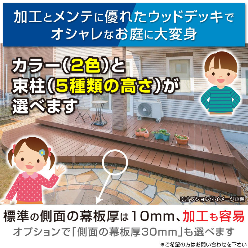 | 商品詳細 | この度は数ある商品の中から当商品を閲覧頂きまして有難う御座います。 商品定価 655,930円 ⇒ 販売価格 310,750円(送料・税込み) ●優れた質感 温もりのある木質感を忠実に再現。 ●高い耐久性・耐候性 天然木に比べ腐食に強く、白アリ等による害虫の心配が 殆どありません。 ●メンテナンスが簡単 経年劣化による変色・色あせが少なく、天然木のように 定期的に塗り替えする必要がありません。 ●キズ補修が簡単 市販のサンドペーパーで簡単に補修ができます。 ●柱は、埋め込み不要の固定柱タイプ 基礎石に付属のアンカーで固定します。 ●施工性の良い穴あけ加工済みの大引 デッキ材を載せて専用金具で固定します。 商品名:人工木 樹脂ウッドデッキ サイズ:間口2.5間4494mm出幅10尺3000mmデッキ床面高さ500mm(切詰可能) 仕 様:標準束柱タイプ 幕板Bタイプ コーナーキャップ仕様 デッキパネル色 :セピアブラウン色、マロンブラウン色からお選び下さい。 束柱・根がらみ色:マットブラウン色 オプションにて束柱と幕板の仕様変更やデッキフェンス・ステップのご提供も 可能です。ご希望の場合は、質問欄にてお気軽にお見積りのお問い合わせ下さい。 この他のサイズも豊富に取り揃えております。お気軽にお問い合わせ下さい。 サイズによっては、側板や根がらみなど部材の一部、に現場カットが必要になる 場合が御座います。 組立説明書はこちらをご覧ください。 |