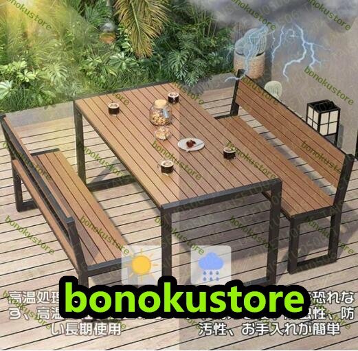 ガーデンテーブル3点セット 屋外ダイニングテーブルとベンチセット 金属フレーム プラスチック製の木製のテーブルトップ 防水性と耐日光性 收藏