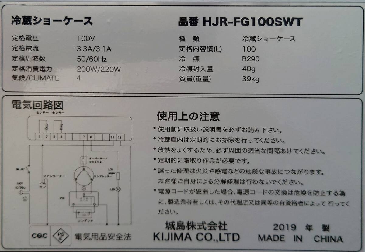 冷蔵ショーケース 100v 城島株式会社 HJR-FG100SWT 2019年 收藏