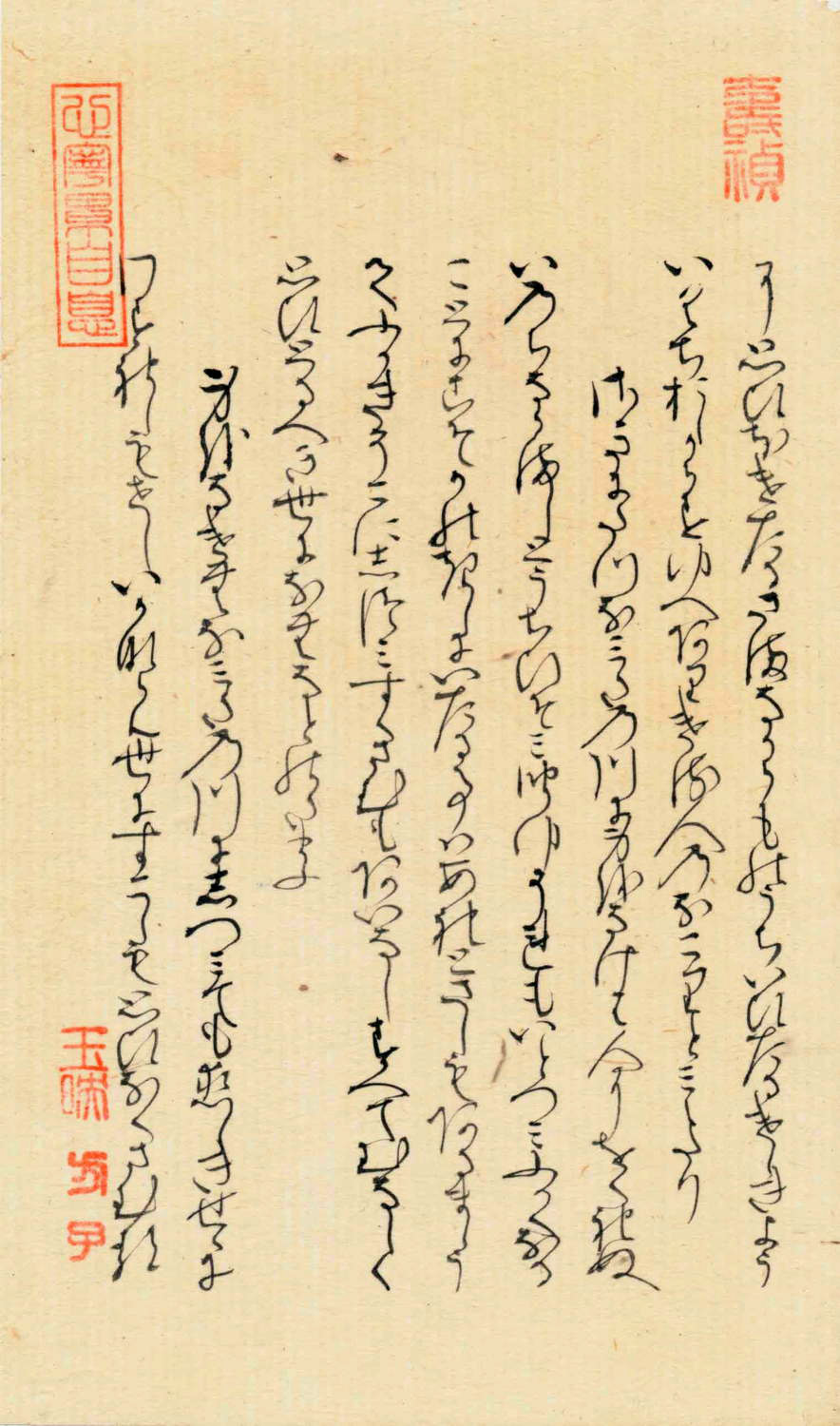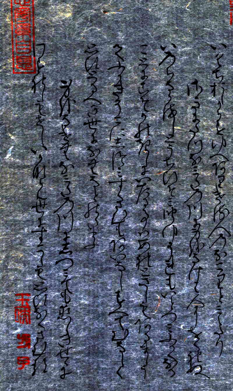 「早蕨(さわらび)」自筆原本上部には、「心寧累自息」《心寧(やすければ)累(るい)も自(おのずか)ら息(や)む》という漢文の篆書印が押捺されている。白楽天の有名な漢詩です。言葉の意味は、「心安らかならば煩(わずら)いも自然に消える」という内容です。紫式部がこの原詩に親しんでいたことがわかる。