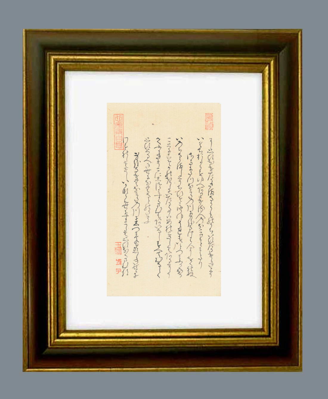「源氏物語」自筆の大きさ タテ21.8センチ ヨコ12.8センチ。額縁の大きさは タテ37.0センチ ヨコ28.0センチです。額縁は新品です。 |