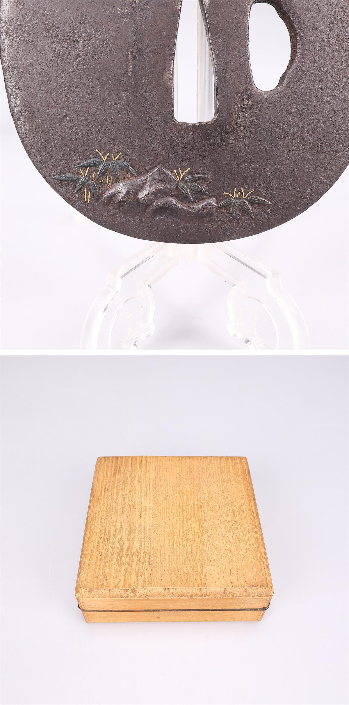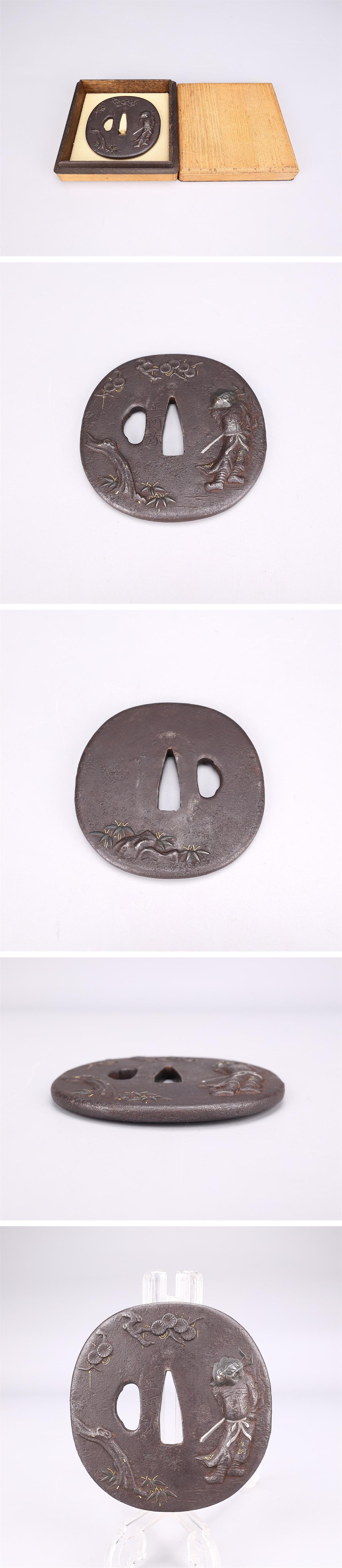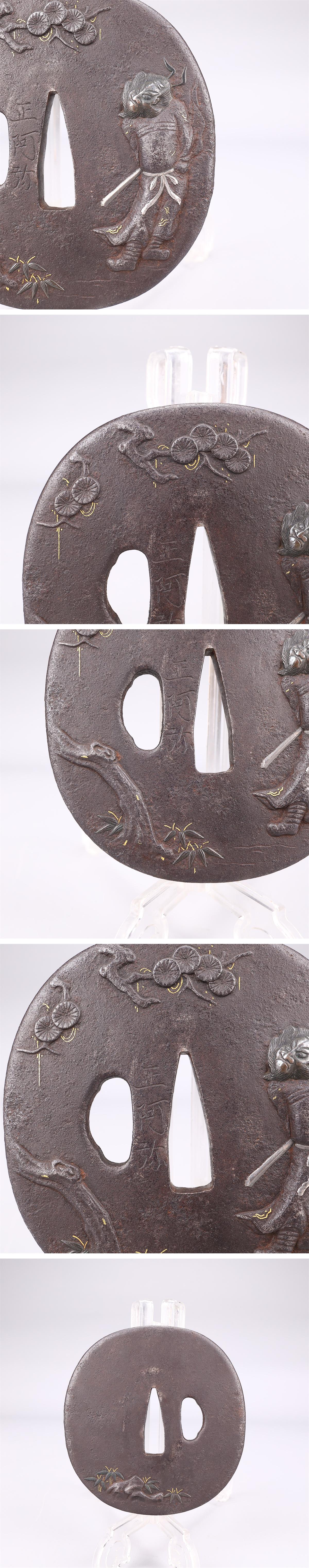 【吉】WB264 時代刀装具 【正阿弥】作 鉄地金銀象嵌 鍾馗紋 鍔 幅8×7.5㎝ 重172g/箱付 美品Y! 收藏
