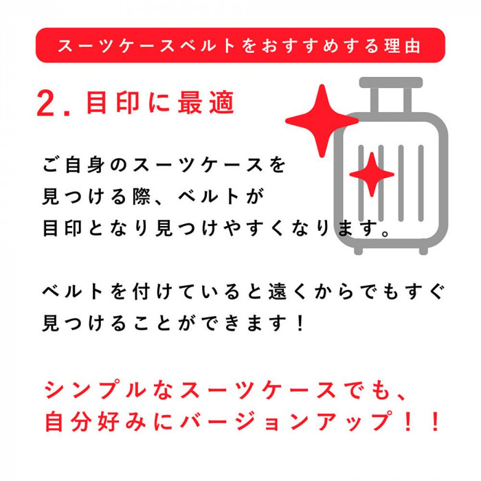 | 大きなキャラクターネームタグが付いたスーツケースベルトです。ワンタッチで簡単に脱着ができます。ネームタグ裏にはネームカードがあり、イラスト付き。スーツケースのサイズに合わせて最大使用長さ176cmまでのサイズ調節が可能です。 |