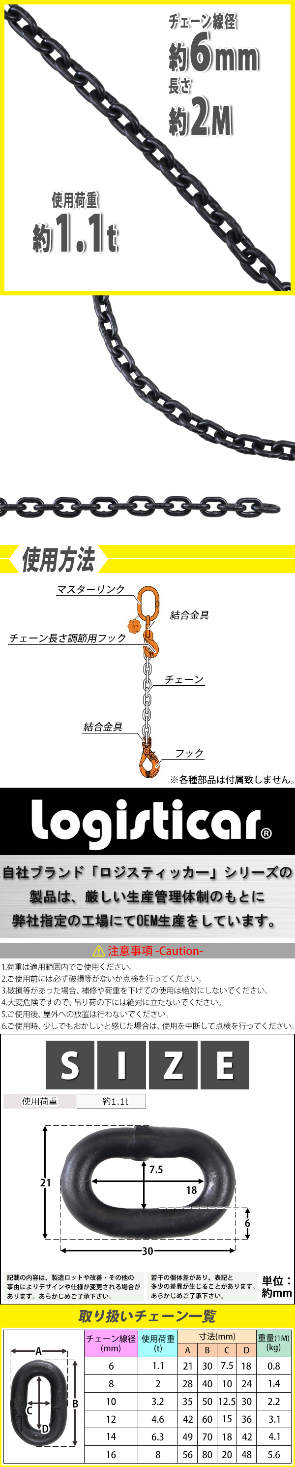 商品紹介 | ■こちらは約2mのチェーンです。 ■使用用途に合わせて自由にカスタム出来るチェーンです! ■様々な場面で大活躍! ■焼き入れを行うことで強度を増しています。 ■簡単接続。 ■シリーズでサイズ、メーターを豊富にご用意しております。 ※こちらは約2m×ご注文個数での発送商品となります。 ※チェーンのピッチにより、長さに多少の誤差が生じます。予めご了承ください。 ■重量:約1.6kg(2mあたり) ■基本使用荷重:約1.1t(1100kg) ■チェーン線径:約6mm ■材質:G80合金鋼(マンガン鋼)(本体) ●新品商品ではありますが、輸入商品の為、多少の擦り傷などがある場合がございますので、ご納得の上ご購入下さいませ。 ●ご購入後、お客様ご都合によるご返品、ご返金等は一切お受け致しておりません。 ●本商品を使用した際に発生したトラブル、事故につきまして、当社は一切の責任を負いません。ご使用に関しましては、全て自己責任にてお願い致します。 |