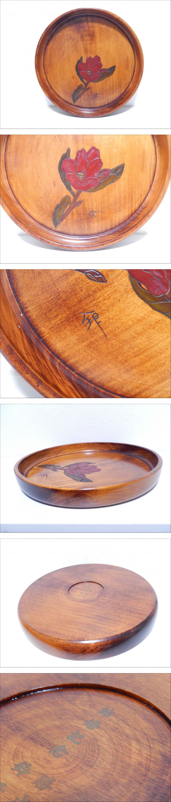 【管SH0645】2000円~ 漆塗 讃岐漆器 銘あり 丸盆 木彫 直径33cm 花一輪 古美術 骨董 さぬき漆器 收藏