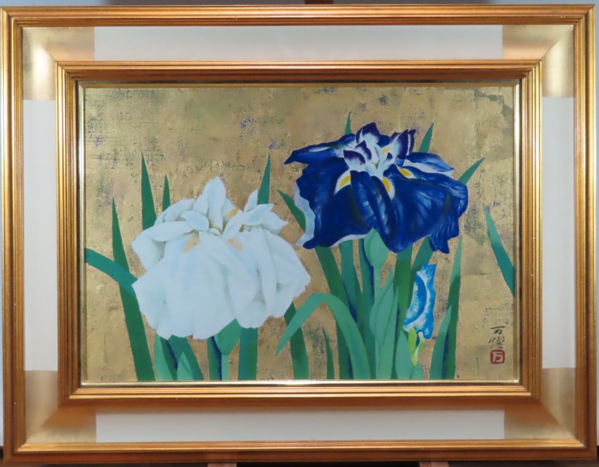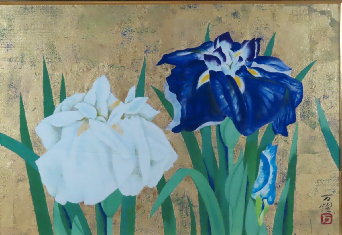 穂高「真作」日本芸術院賞 伊東万耀 「菖 蒲」日本画 10号 共シール 收藏