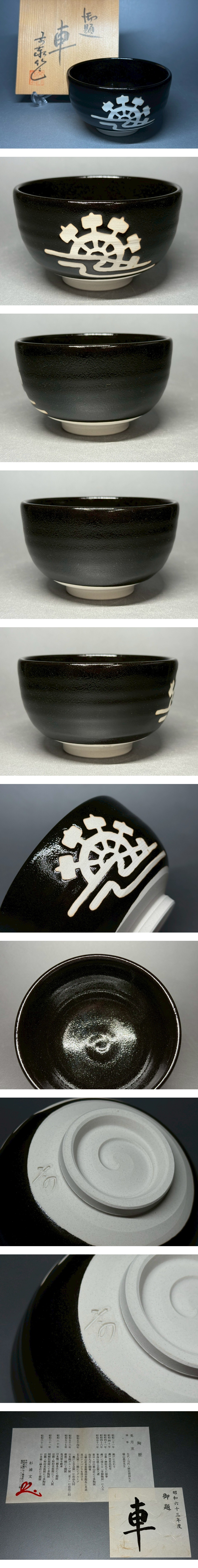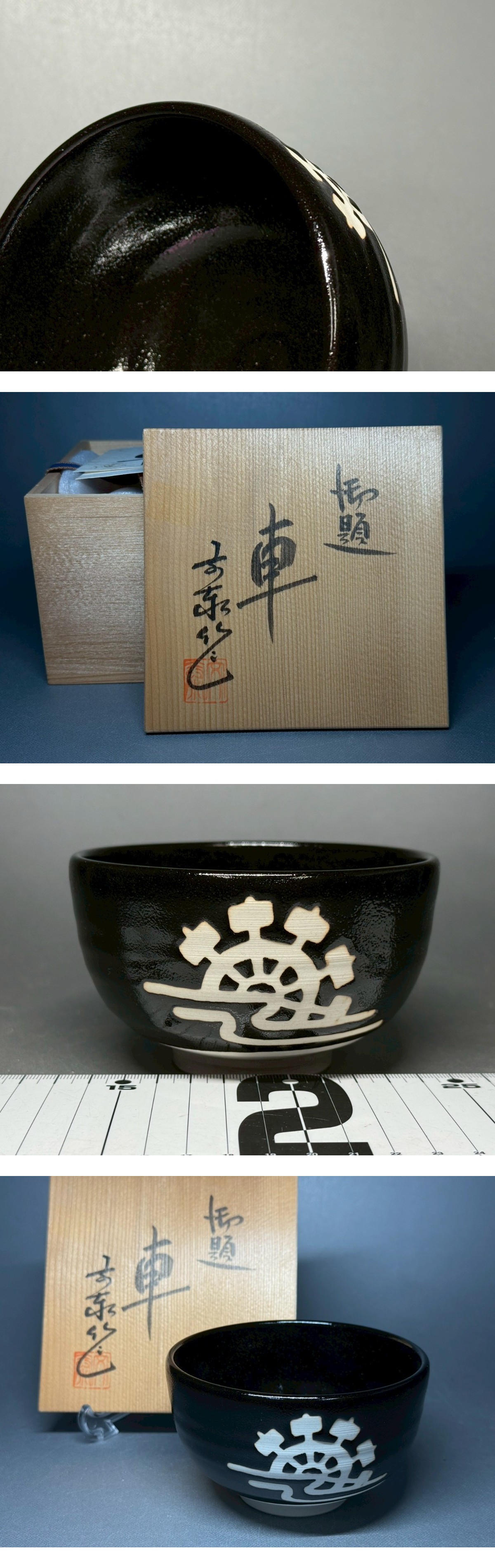 瀬戸焼 兎月窯 杉浦文泰作 車 御題 茶碗 共箱 茶道具 茶器 茶懐石 茶事 茶碗 抹茶碗 陶器 作家物 在銘 陶印 骨董 時代物 煎茶道具36 收藏