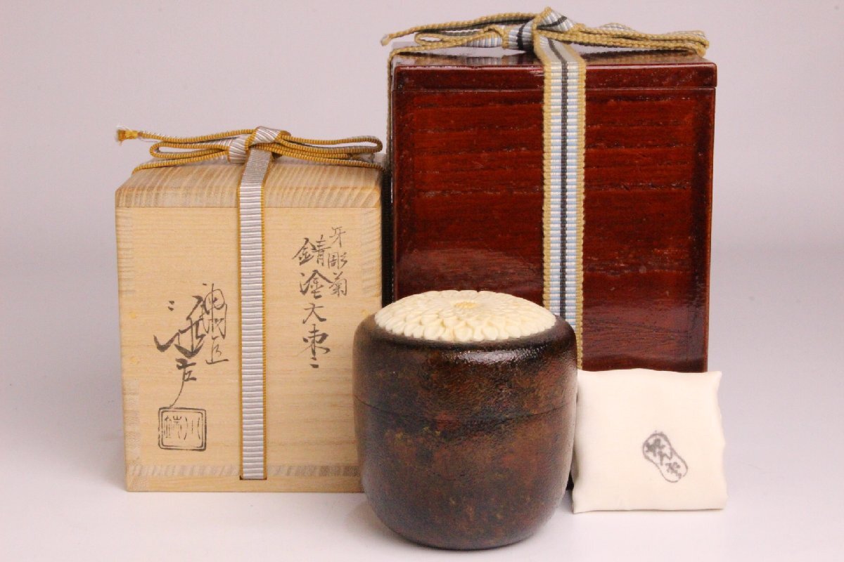川端近左 特別作 牙彫菊 錆塗大棗 2重箱「共箱・共布」