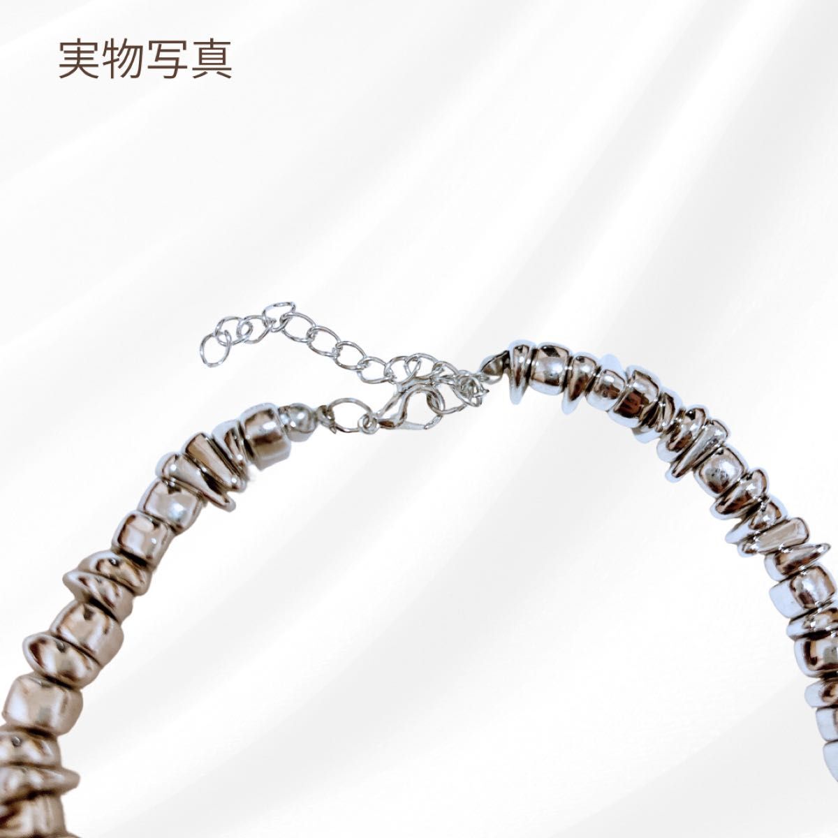 ランダムな形のメタルパーツを連ねた、モダンで存在感のあるデザインネックレスです。