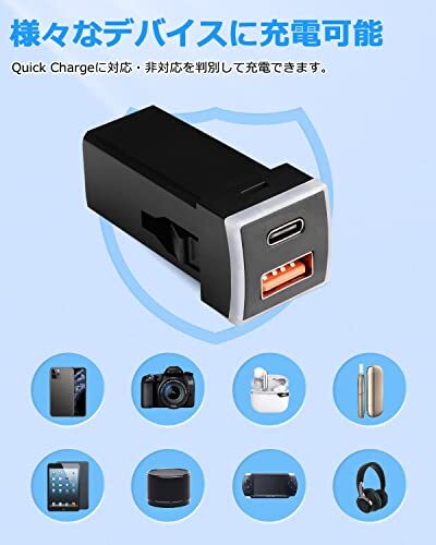 対応車種:トヨタ【アルファード40】【ランドクル250】【ヴォクシー ノア 90系】【ヤリス】【カローラ】【新型ライズ】【新型シエンタ】【新型アクア】【ハリアー】【スペーシア】【新型日産ルークス】【新型アルト】【新型デリカミニ】【新型セレナ】【ソリオ】【新型クロスビー】【ライズ】【RAV4 50系/PHV】【ランドクルーザープラド 150系 後期】【カローラ 210系】【ハリアー80系】【ヤリス】【ヤリスクロス】ダイハツ【タント】【ロッキー】【スバル シフォン】注:購入前に車の取り付け穴のサイズを測定してください。この充電器は、約22.5x 22.5mmのサイズの穴を取り付ける場合にのみ適しています。※その他の車種でも本体サイズのポートであれば取付け可能となります。