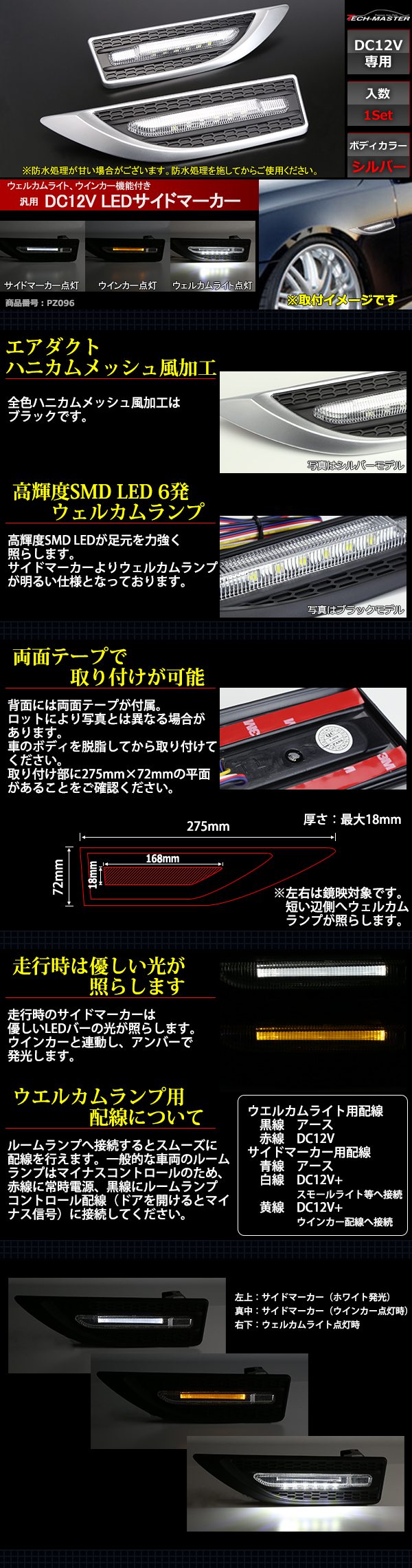 ■商品コード PZ096 ■商品タイトル DC12V専用 汎用 LEDサイドマーカーランプ ウェルカムライト、ウインカー機能付き ■対応電圧 DC12V ■ボディカラー シルバー ■発光色 サイドマーカー:ホワイト サイドマーカー(ウインカー時):アンバー ウェルカムライト:ホワイト ■数量 1セット2個(鏡映対象) ■特徴 汎用のLEDサイドマーカーです。 既存のサイドマーカーからの変更やサイドマーカーの増設におすすめです。 取り付け部に275mm×72mmの平面があることをご確認ください。 車のボディを脱脂してから取り付けてください。 ■配線に関して ウエルカムライト用配線 黒線:アース 赤線:DC12V サイドマーカー用配線 青線:アース 白線:DC12V+(スモールライト等へ接続) 黄線:DC12V+(ウインカー配線へ接続) ウエルカムライト用配線はルームランプへ接続するとスムーズに配線を行えます。一般的な車両のルームランプはマイナスコントロールのため、赤線に情電源、黒線にルームランプコントロール配線(ドアを開けるとマイナス信号)に接続してください。 ■その他商品 その他のボディカラー デイライト 24V 汎用マーカー 12V 汎用マーカー 24V 汎用リフレクター 12V 汎用リフレクター |
